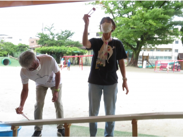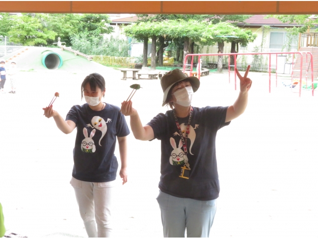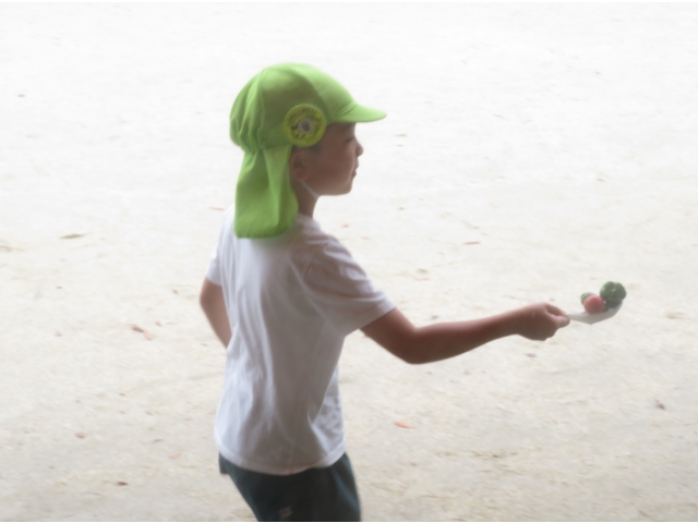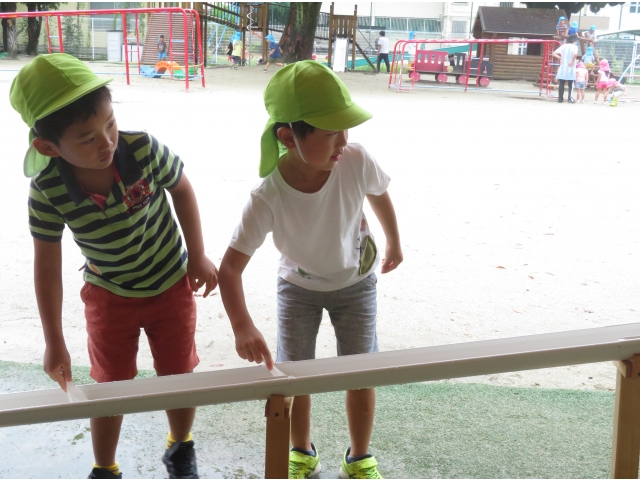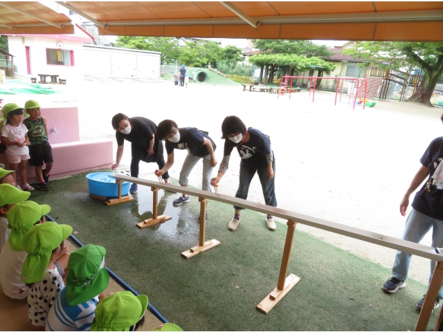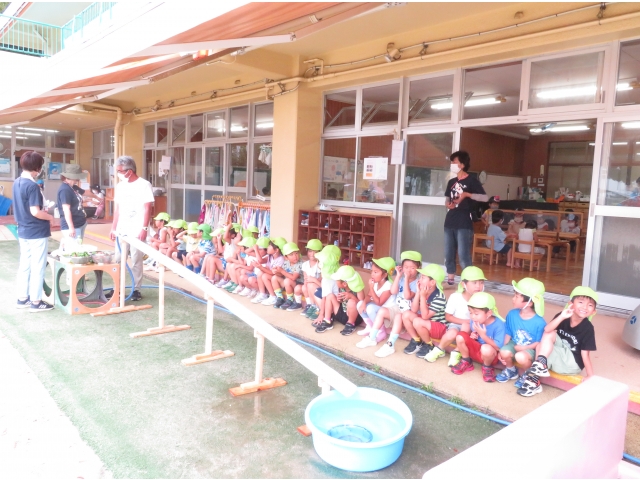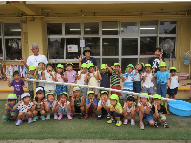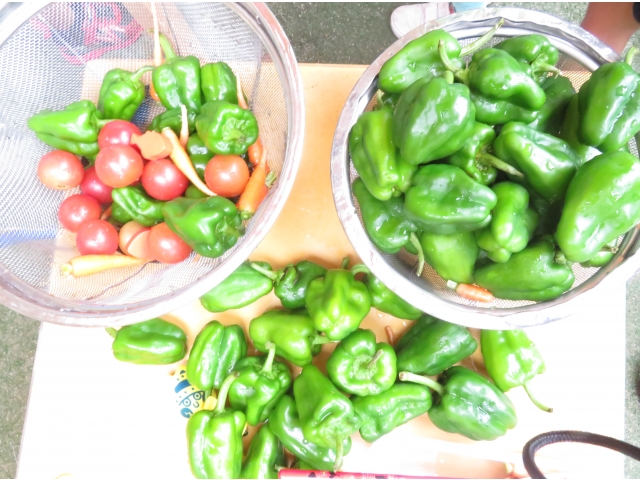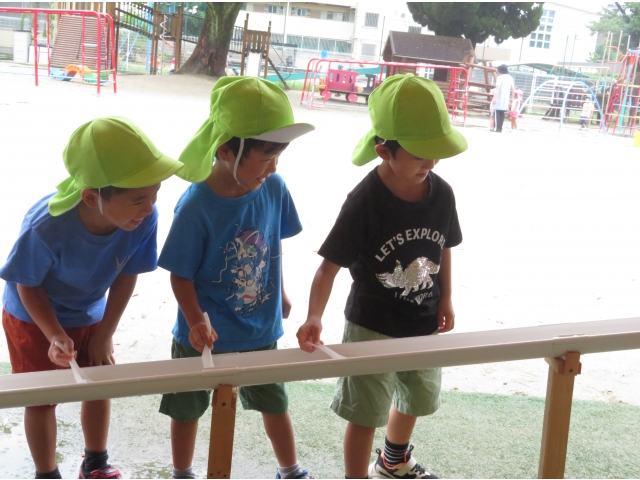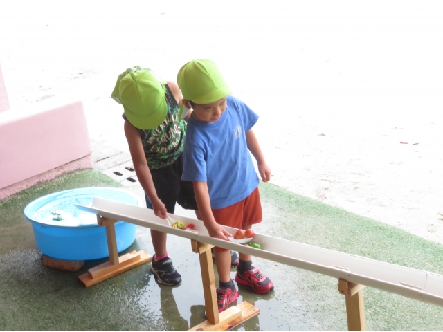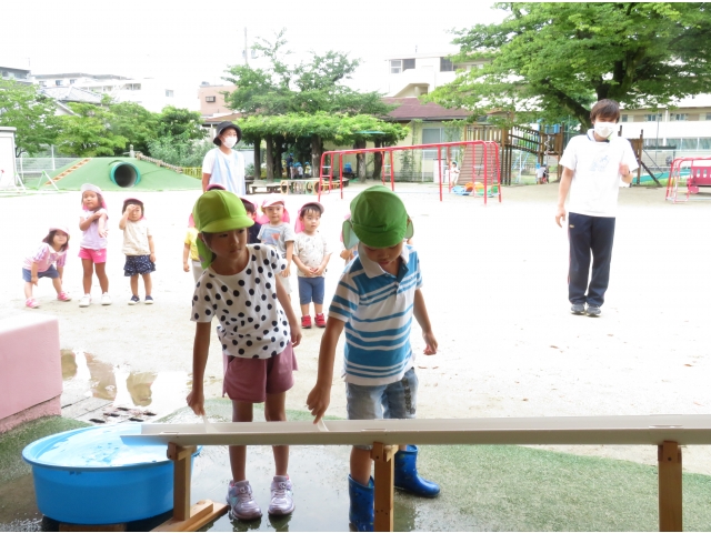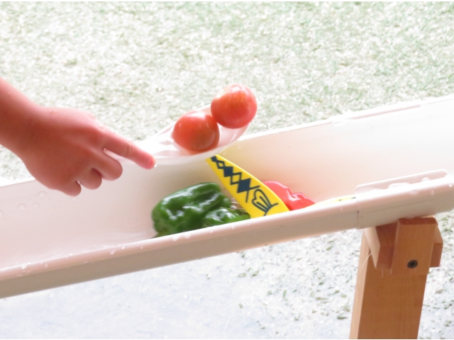 ぞう組のお友だちは、園の畑で収穫したトマト・ピーマン・人参、ゼリー、そしておもちゃの魚など色々と流れてくる物をれんげですくい取りました。
