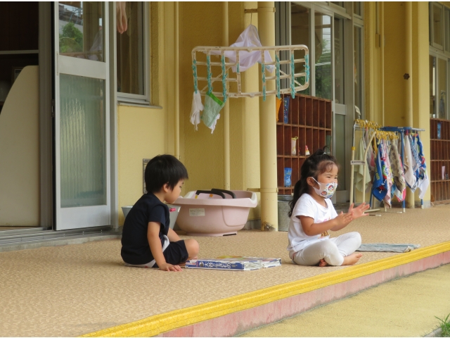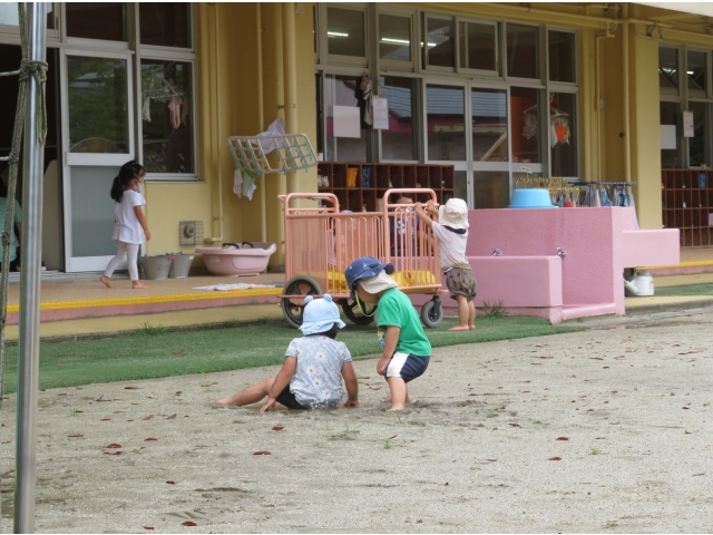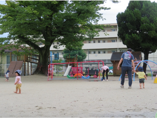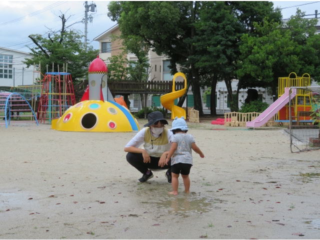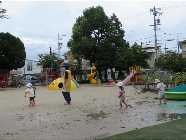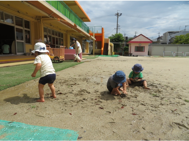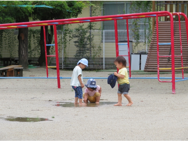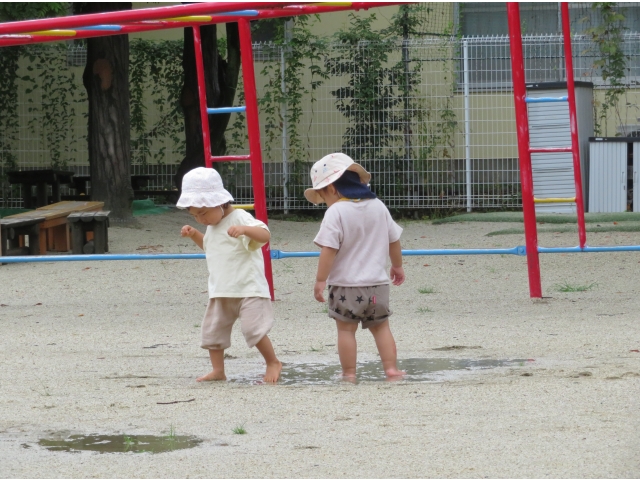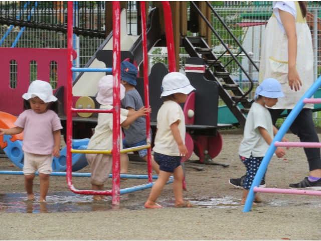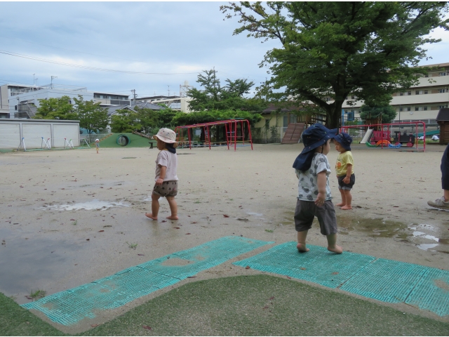 1歳児のうさぎ組、りす組の子どもたちは裸足で園庭に出てきました。