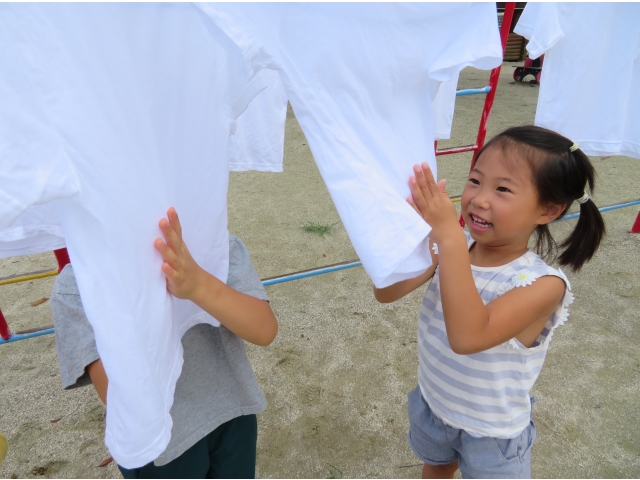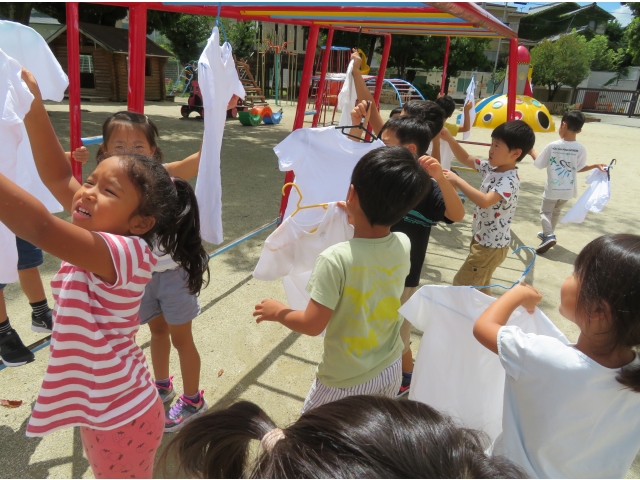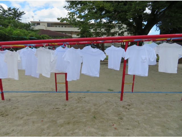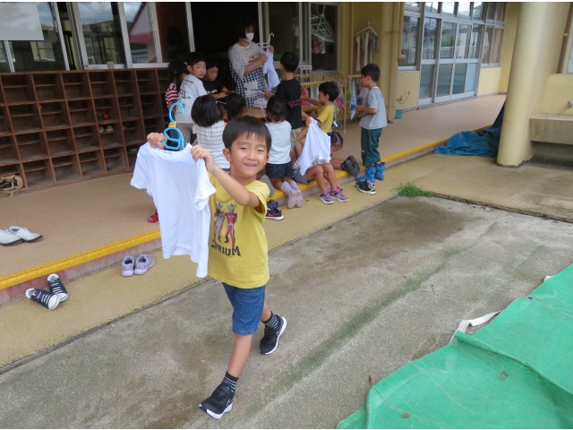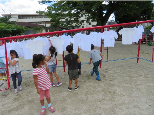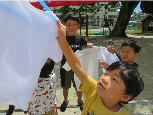 みんなが楽しみにしているTシャツ染めが始動しました。今日は洗濯をしてTシャツに付いているのりを落とすことをし、子どもたちは自分でハンガーにTシャツをかけて干しました。