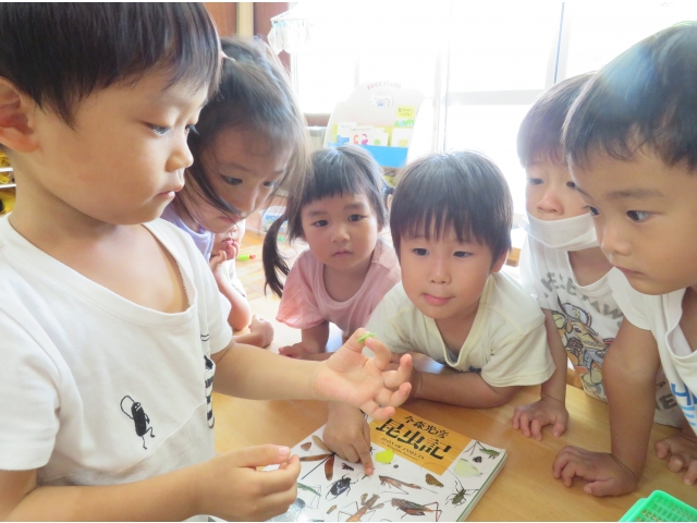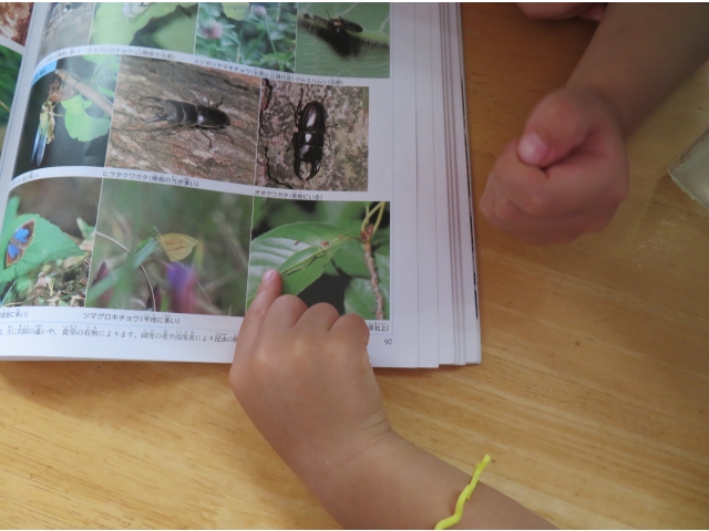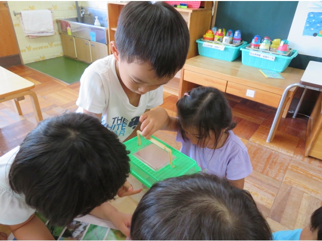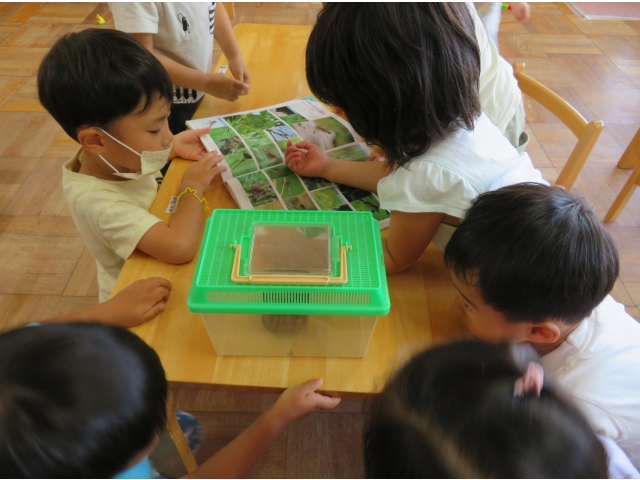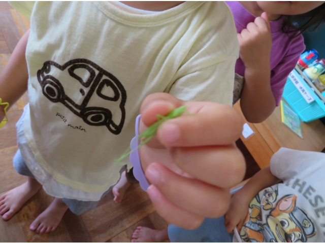 タモを持った保育者と一緒にセミとりに行くのが大好きなたんぽぽ組の子どもたち。今日はセミがいないね...と話していた日、畑でバッタを見つけました。