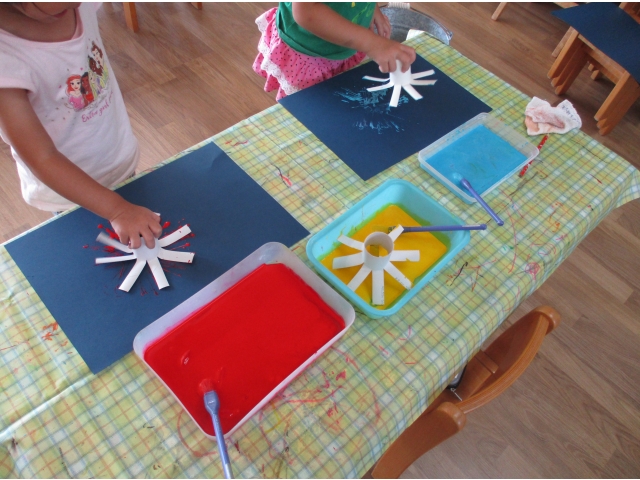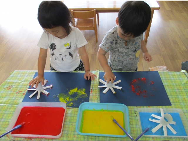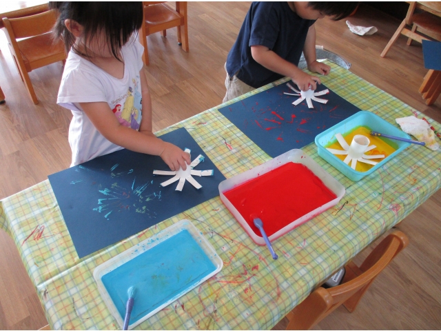 八月の製作でトイレットペーパーの芯を使って花火を作ってみました。絵の具は、赤、黄色、水色の三色を使いました。
