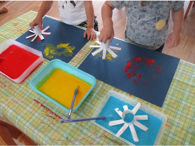 トイレットペーパーの芯を8回切ったもので花火を描いてみました。