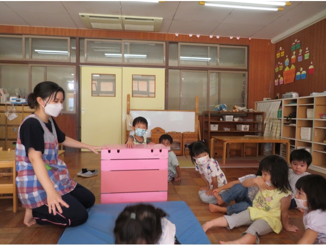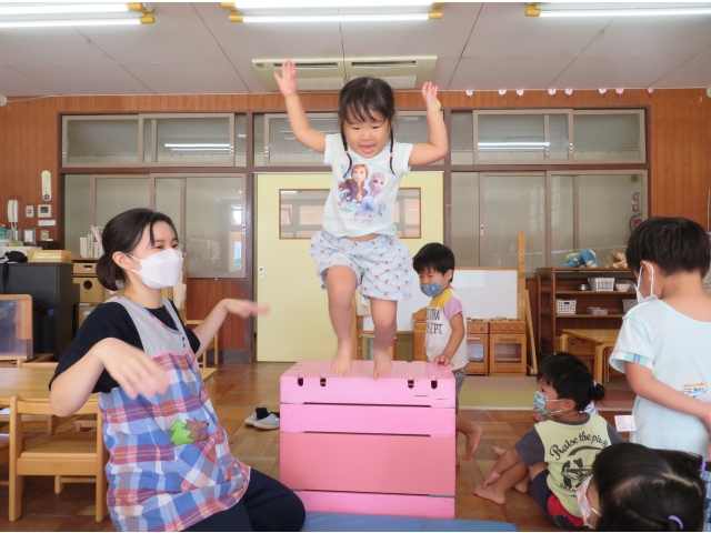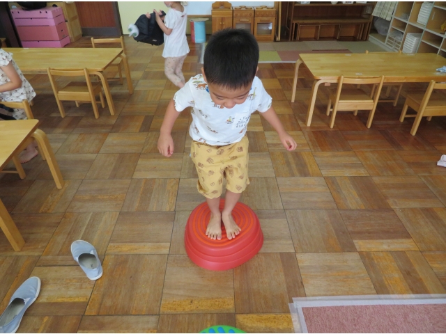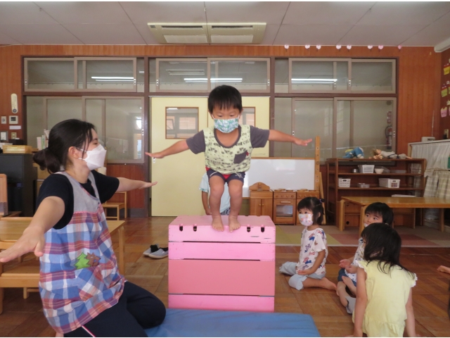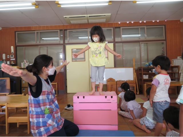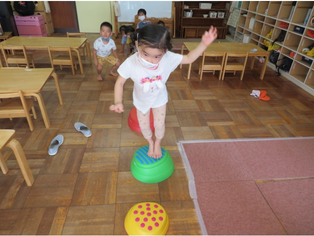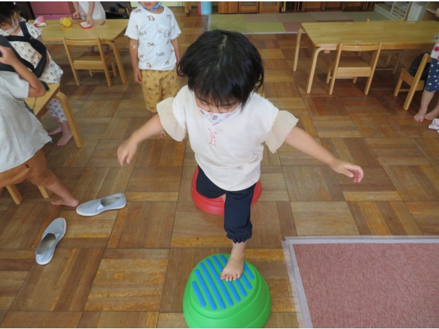 体を動かすことが大好きなすずらん組のお友だち。保育者がお部屋で遊べる巧技台やとび石を用意すると「やりた~い!」と元気な返事を返してくれました。