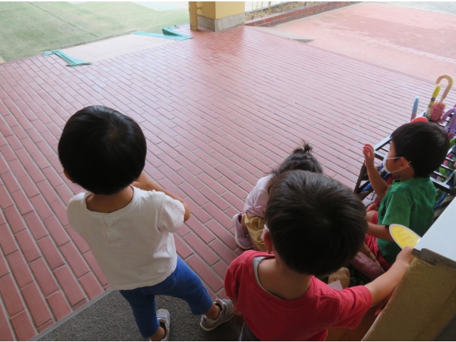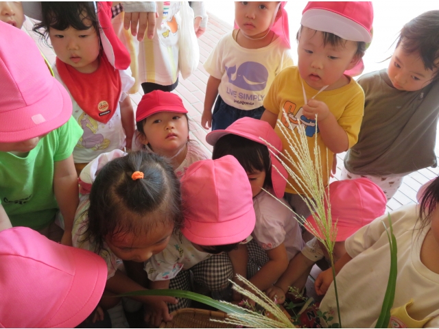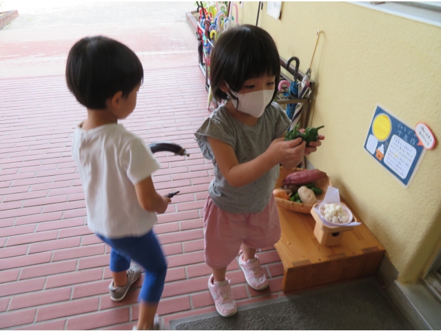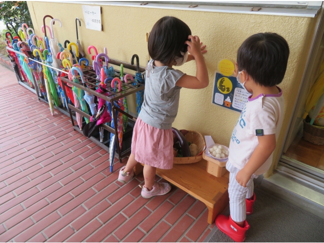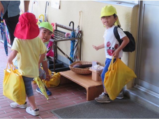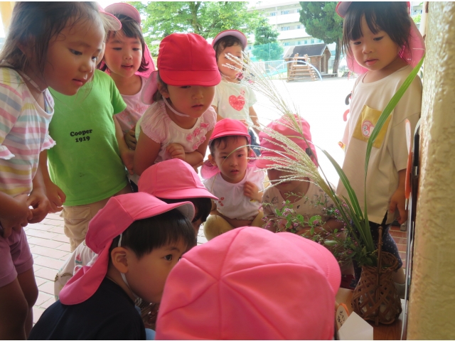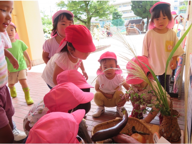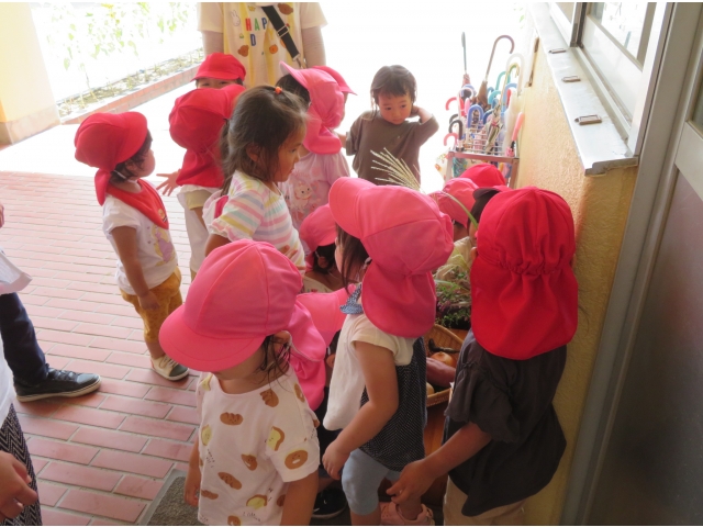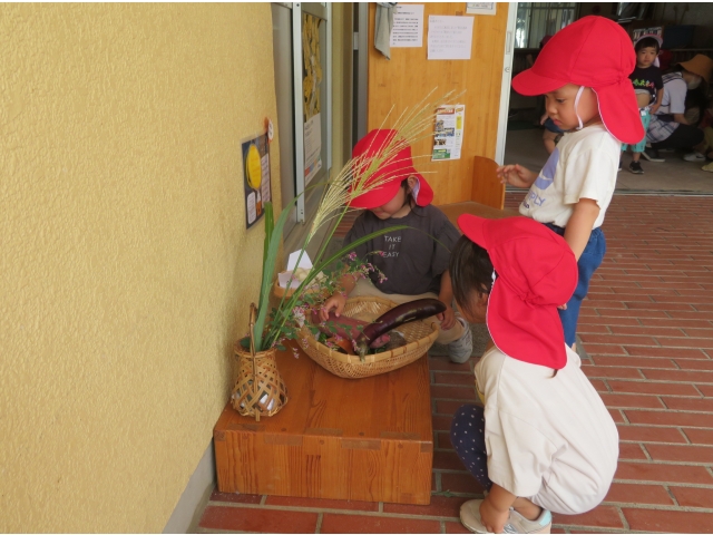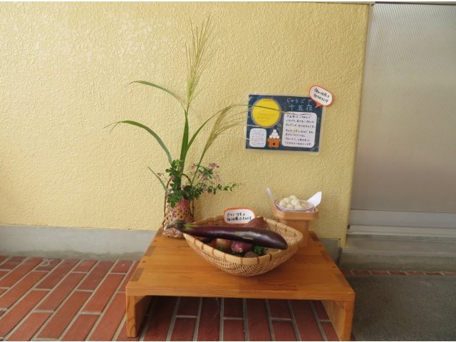 ちょっと早めに園でも玉ねぎ、里芋、さつま芋そして畑で収穫したナスやピーマンをおつきさまにお供えしました。