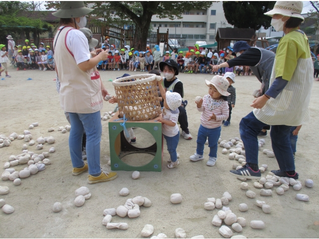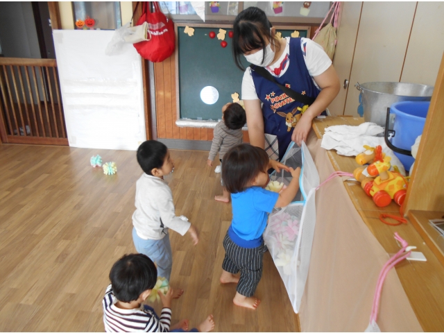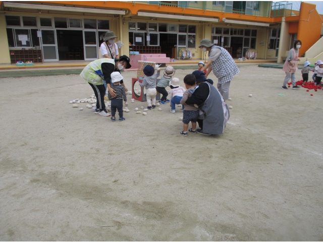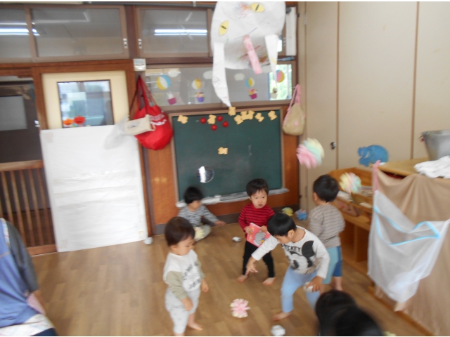 先日運動会ごっこで玉入れに挑戦!ひろってカゴにいれてを楽しんでました。