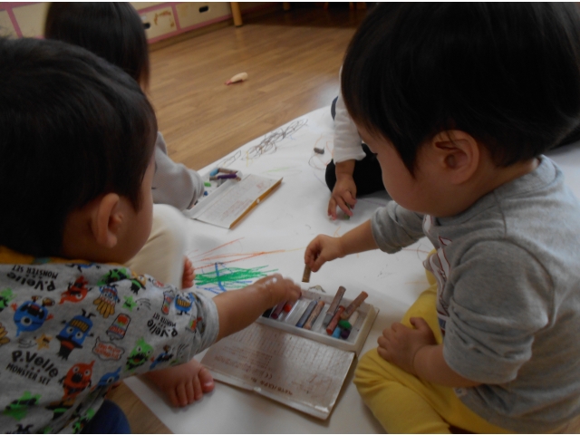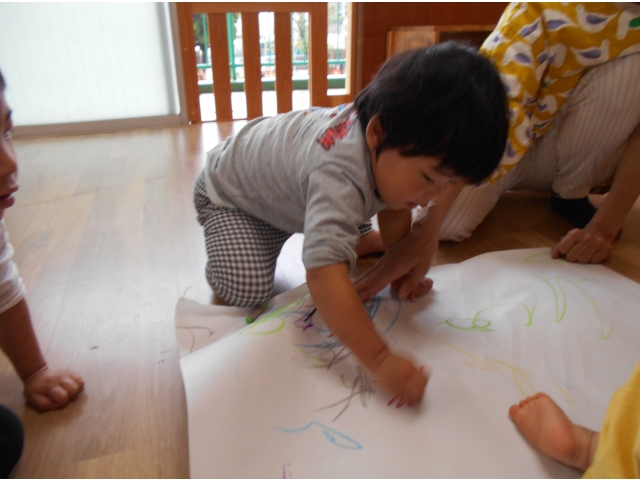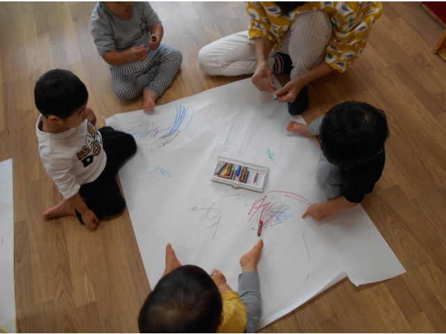 雨の日に大きな紙を用意してクレパスでなぐり描きを楽しみました🖍
