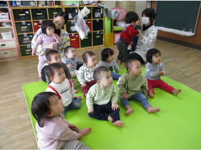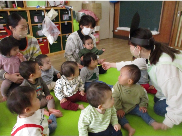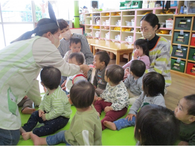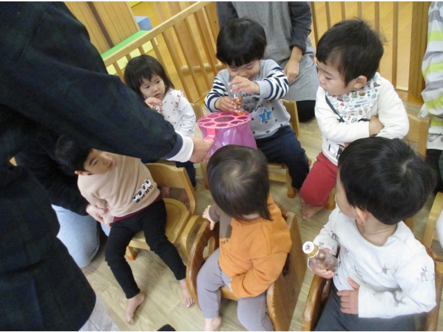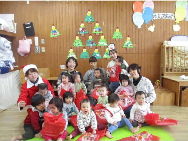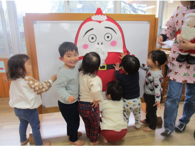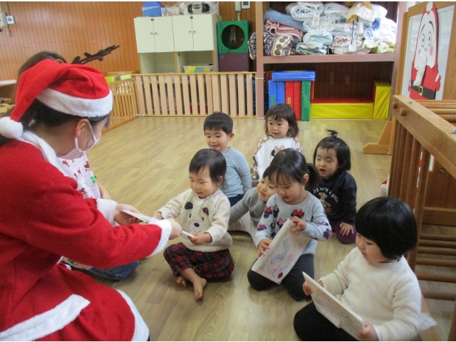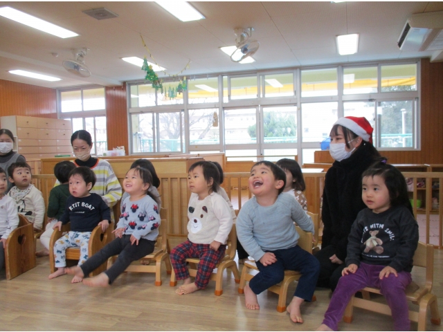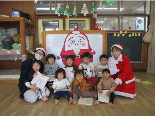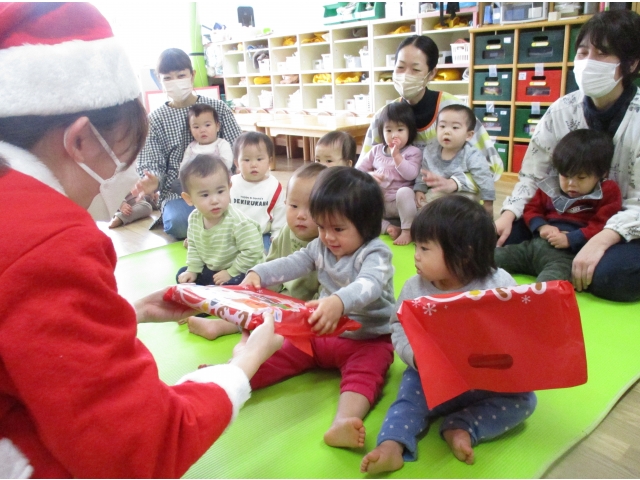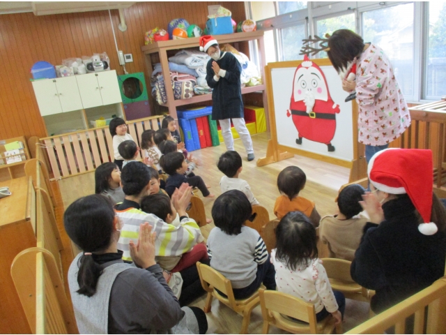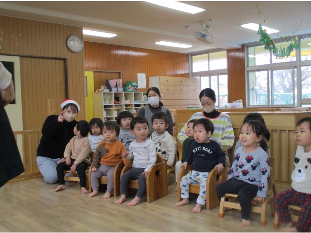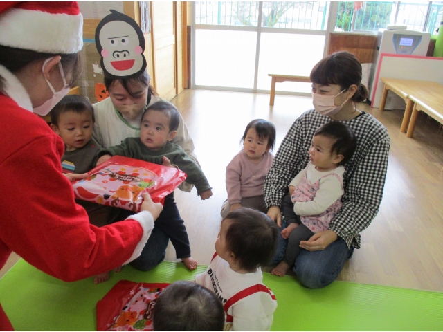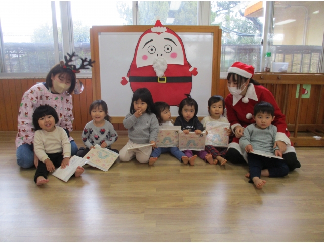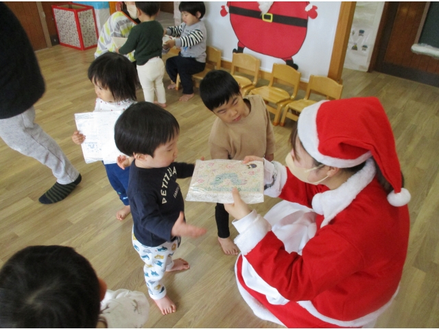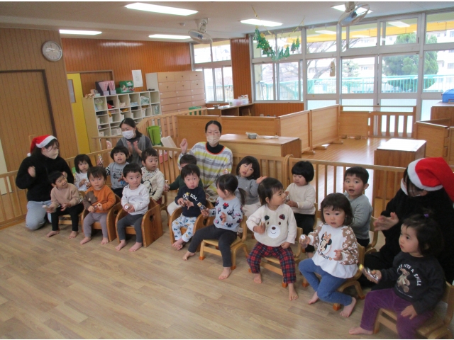 各学年で歌ったり、ペープサートで楽しんだ後にサンタさんに扮した担任の先生からプレゼントをもらいました♡