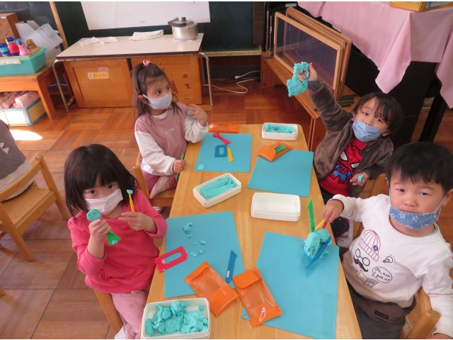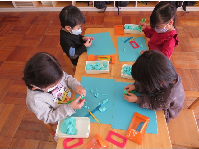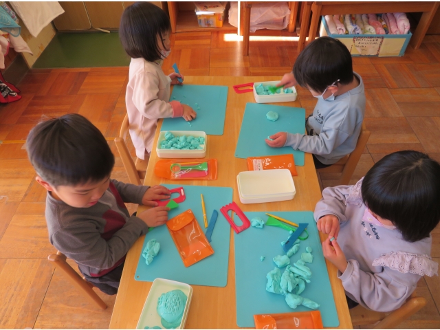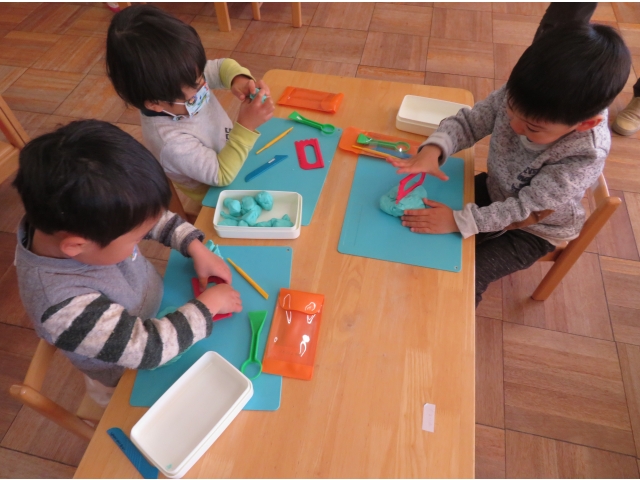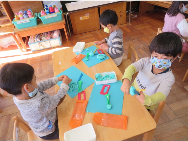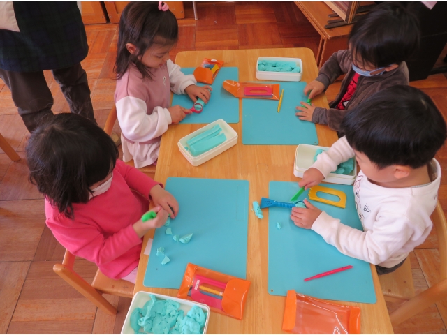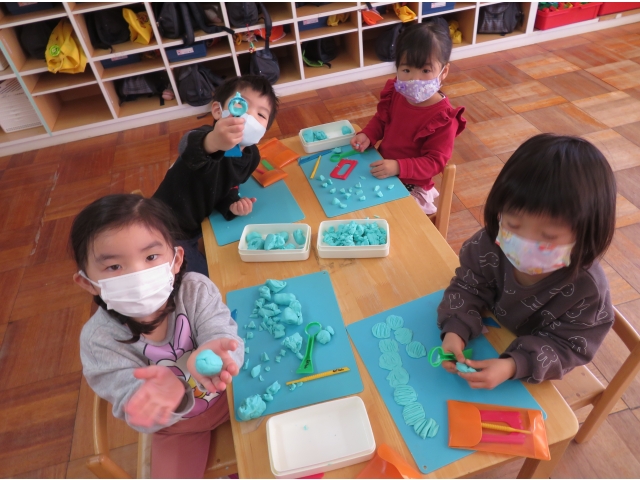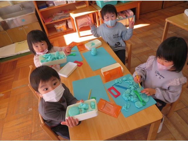 寒い日も園庭で元気いっぱいに遊んでいる子どもたち。お外で遊ぶのも大好きですが、部屋で遊ぶのも大好きです!この日は行事や大掃除を頑張ったご褒美として要望が多かった粘土遊びをしました。
