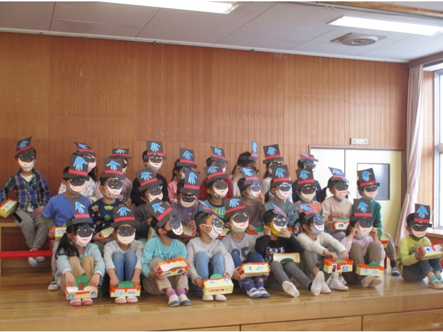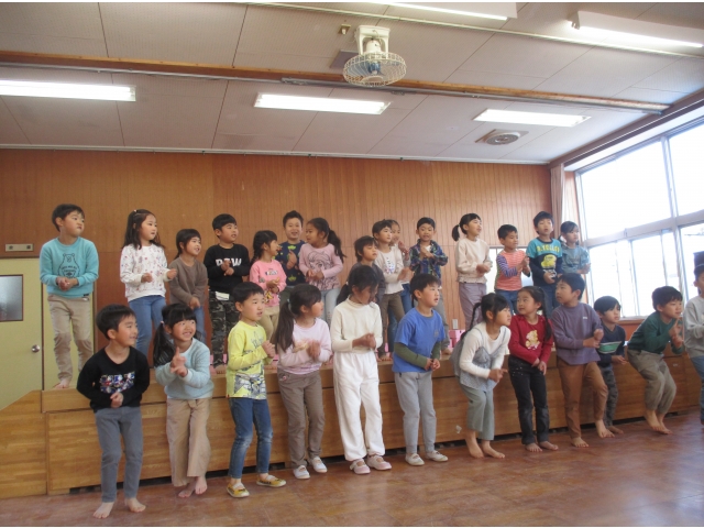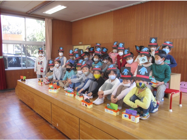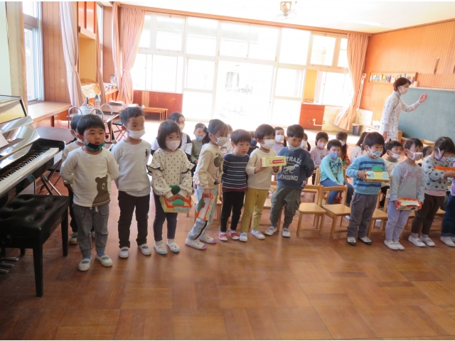 3月7日にぞう組のお友だちの卒園を祝う会をしました。 卒園を祝う会の前には、0歳児のお友だちはカレンダー、1歳児のお友だちは冠、2歳児のお友だちはメダル、3歳児のお友だちは小物入れをプレゼントしました。