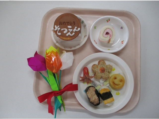 - 給食室からのお祝いメニューです♡