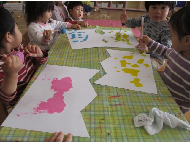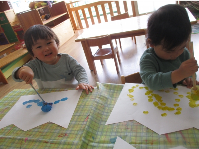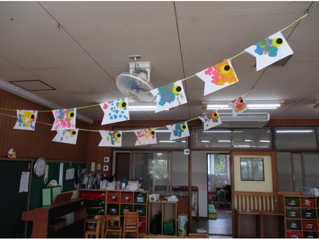 水色、ピンク、黄色を使ってかわいいこいのぼりができました!部屋を泳ぐこいのぼりを見て「あれ○○ちゃんの!」と指を指して喜んでいました!