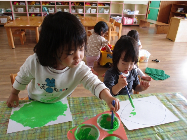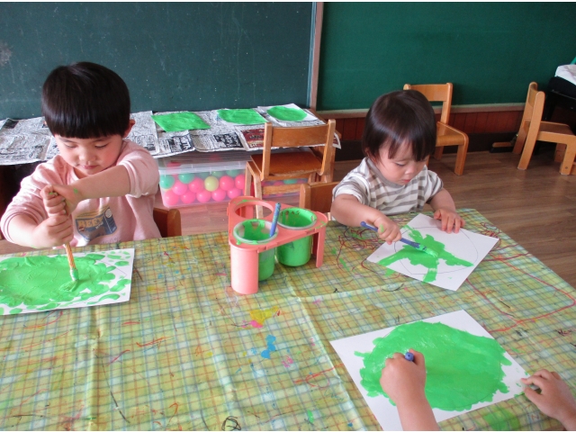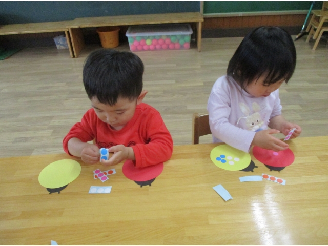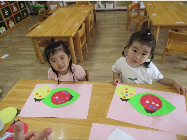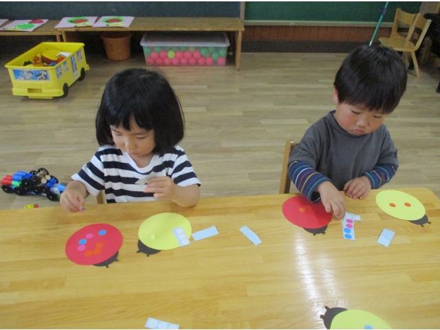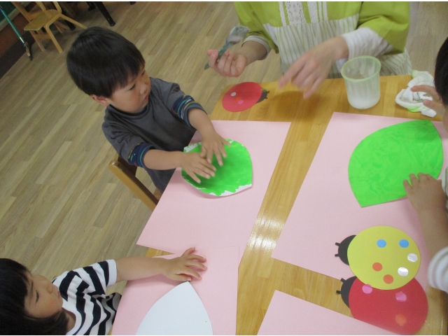 みんなで絵の具を塗ったり、シールをはったりしててんとうむしを作りました。