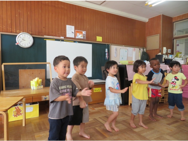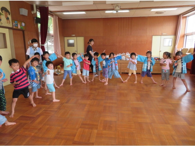 なつまつりに向けて、5歳児が中心となり、お店屋さんで使う食べ物やゲーム等考えて作たり、当日に着るティシャツ染めをしたり、盆踊りで踊る踊りを覚えたりし準備をすすめてきました。