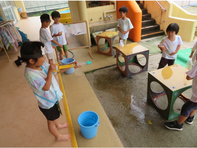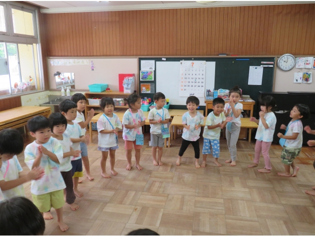 2日目のなつまつりは、ぞう組、きりん組のお友だちが作ったTシャツ染め手作りの服を着て行いました。