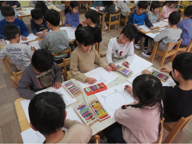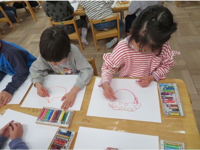 まずは画用紙にクレパスで鬼をかきかき…