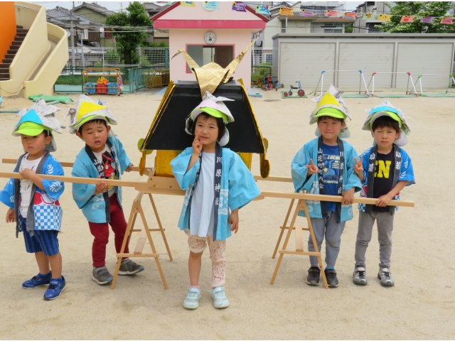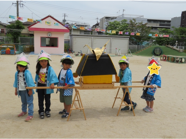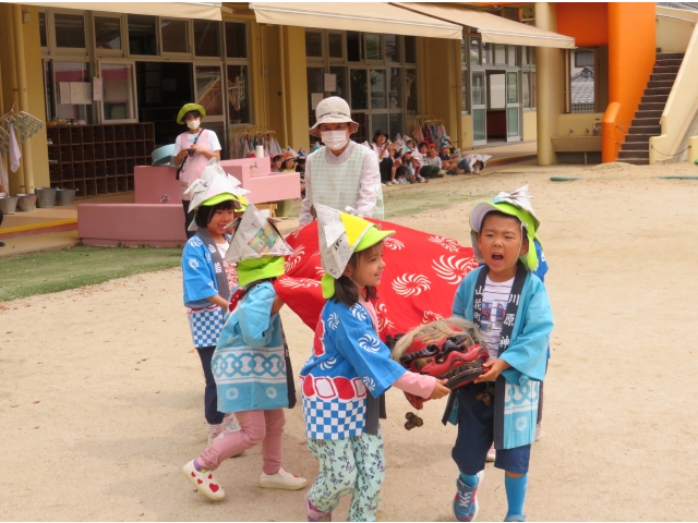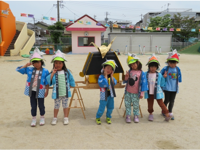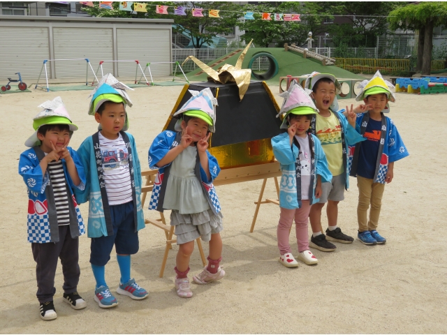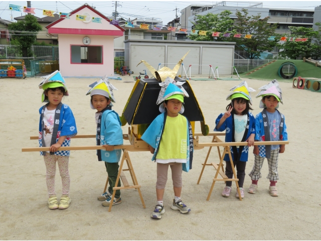 3歳児のお友だちは5歳児さんからもらった手作りかぶと、4.5歳児のお友だちは自分で作ったかぶとをかぶり楽しみました♪