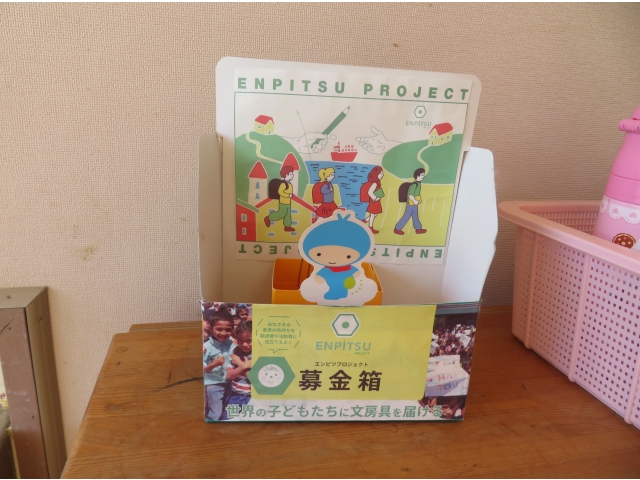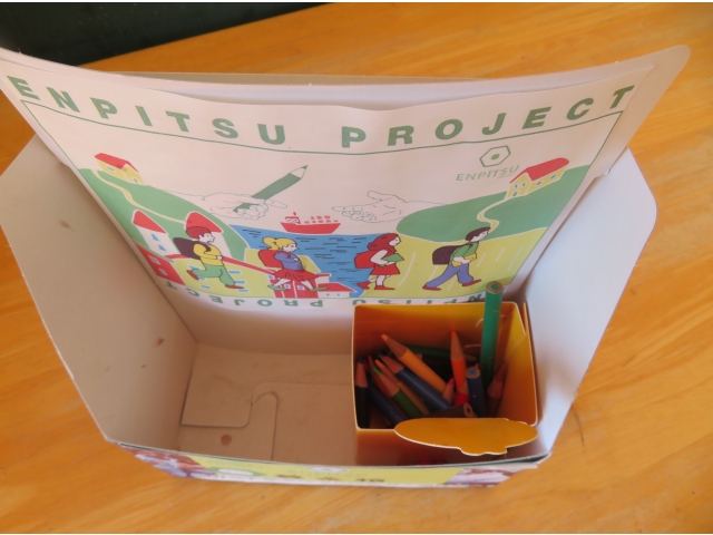 子どもたちがお絵描きなどに使って短くなった鉛筆や色鉛筆を箱に入れておき、明治安田生命の担当の方が回収にきてくれます。