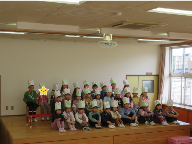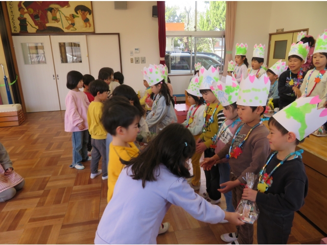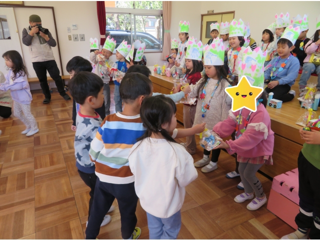 お祝い会の前には、0歳児のお友だちからカウントカレンダー、1歳児のお友だちから冠、2歳児のお友だちからは粘土で作った水晶玉のペンダントをプレゼントをされ大喜びのぞう組さん(*^^*)