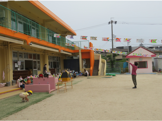 朝子どもたちの作ったこいのぼりを飾っていると、子どもたちも自分のこいのぼりを探しながら一緒に手伝ってくれました。