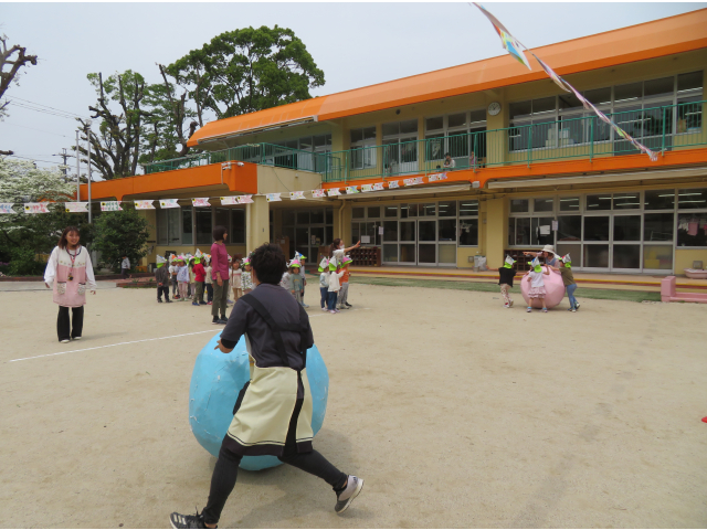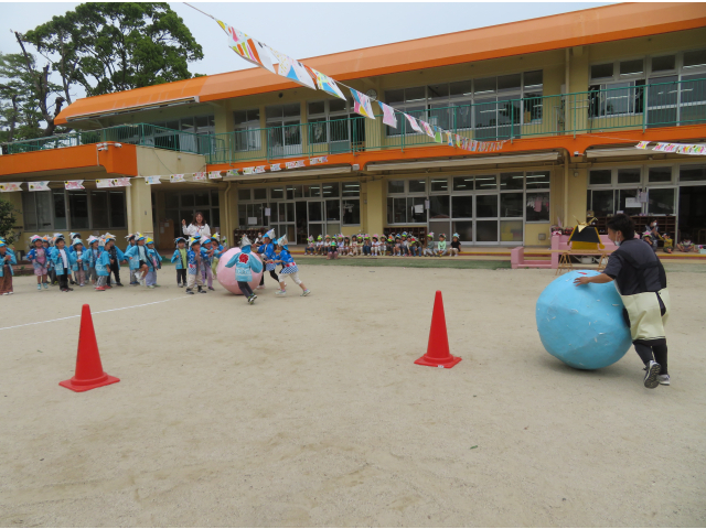 - 4.5歳児は先生たちと対抗大玉ころがし!