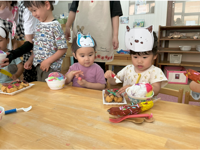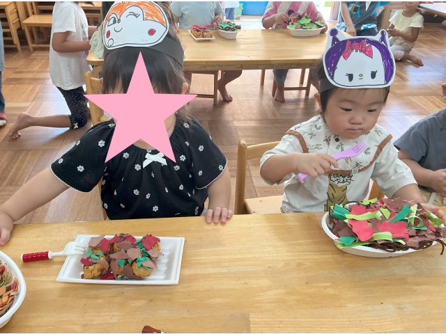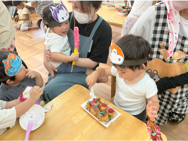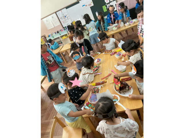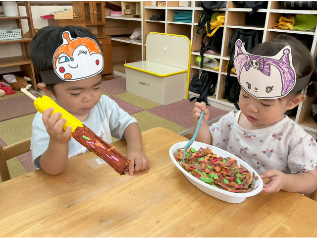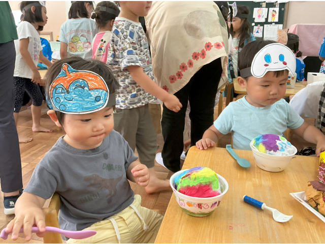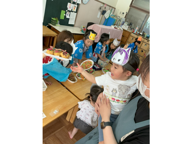 幼児クラスの行事、夏まつりに参加しました。前日にぞう組さんがプレゼントしてくれたお面をつけとてもうれしそうなうさぎ組の子ども達です。