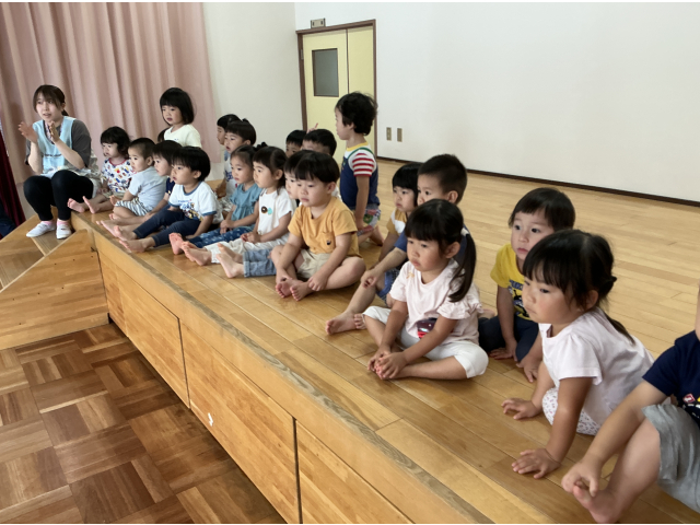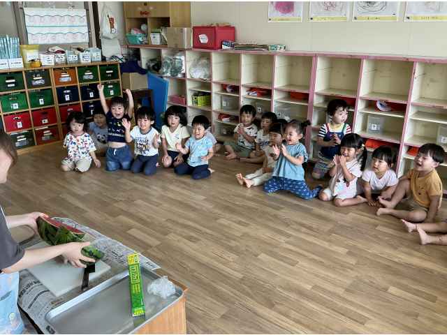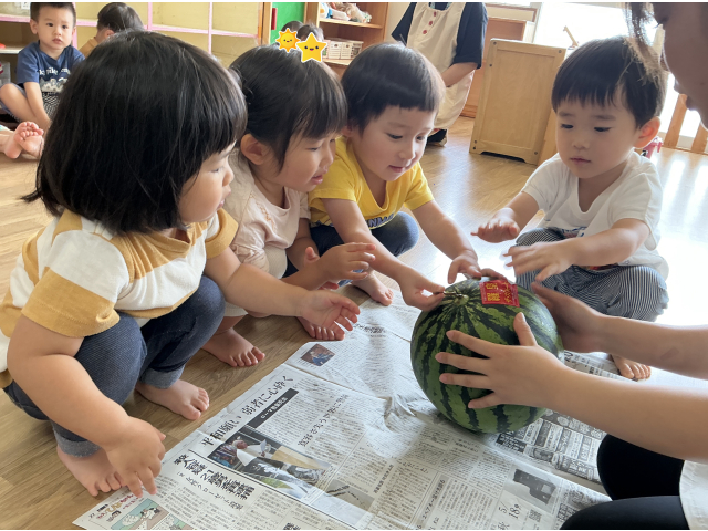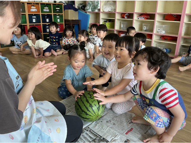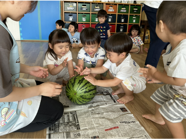 幼児さんのすいかわりを応援しに行きました。その後、お部屋でもすいかわりをやってみました!