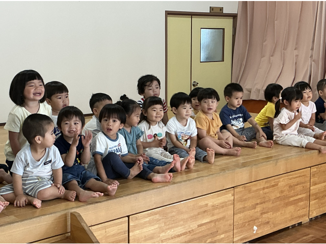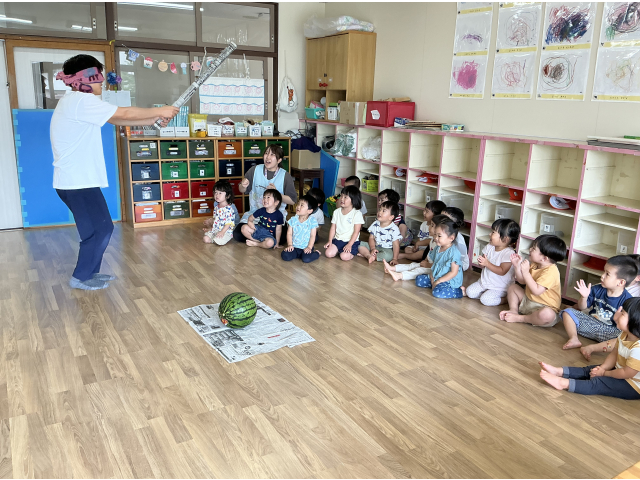 みんなの方に先生が来ちゃうと「こっちじゃないよ~!」と笑いながら教えたり、すいかに棒が当たると拍手をしたりと、たくさん楽しむことができました🎵