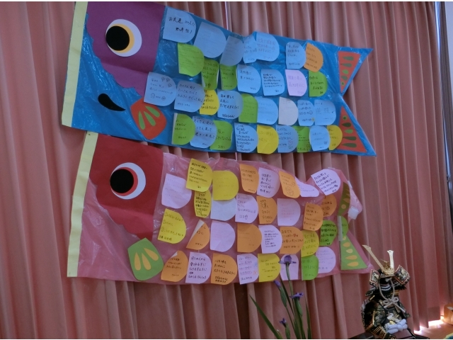 ホールに飾ってあったこいのぼりには保護者の方の願い事をうろこに書いてもらいました。