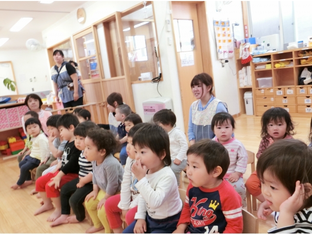会が始まり、司会の保育者とのやり取りを楽しんだり、主任先生のお話しに真剣に耳を傾けたりしていました。