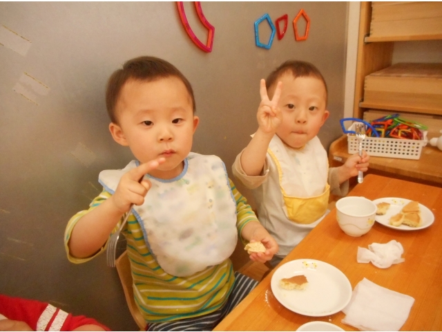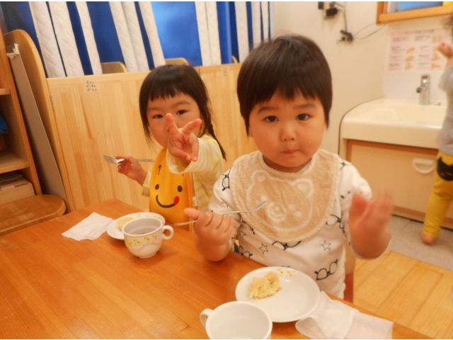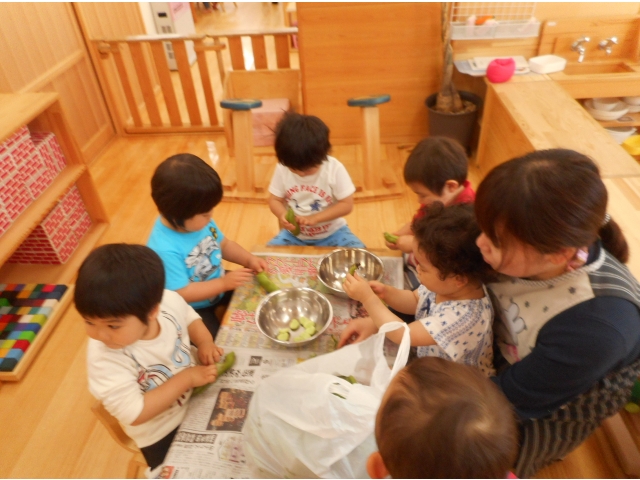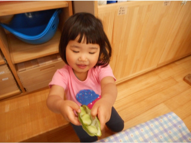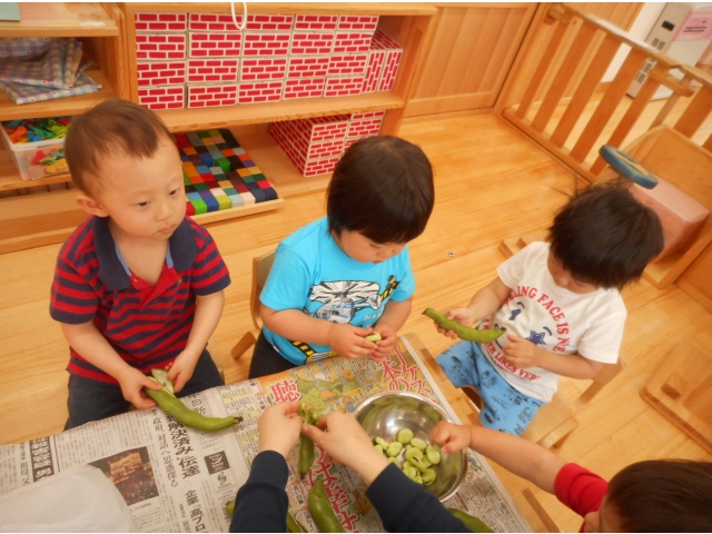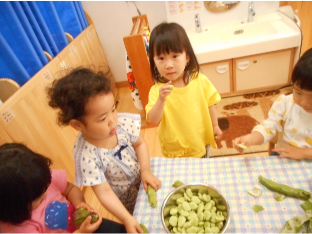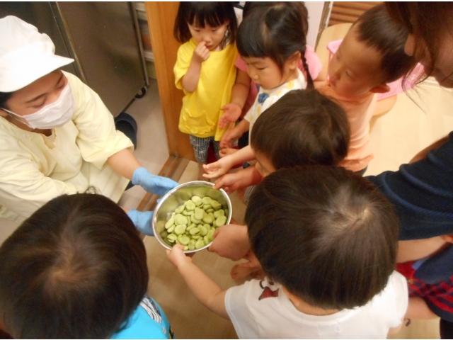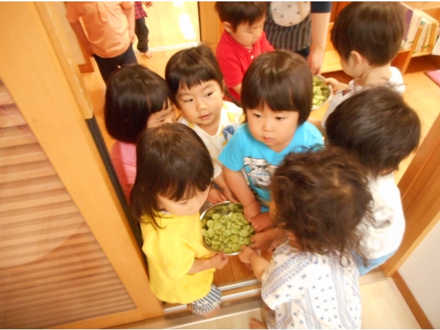 すごい集中力でたくさんあった空豆があっという間になくなってしまいました。もっとちょーだい!とアピールしている子どもたち。