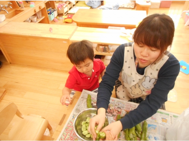 五月の初めには空豆の皮むきを行いました(^O^)