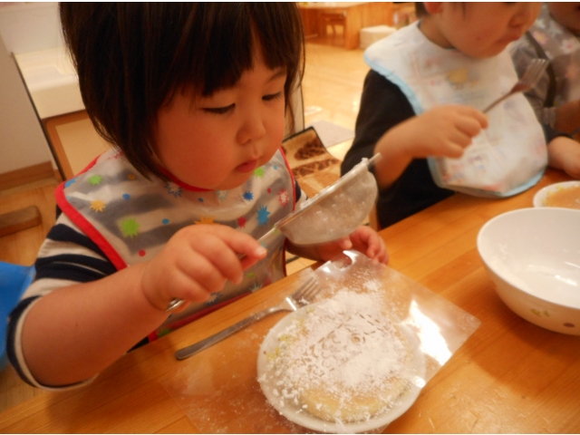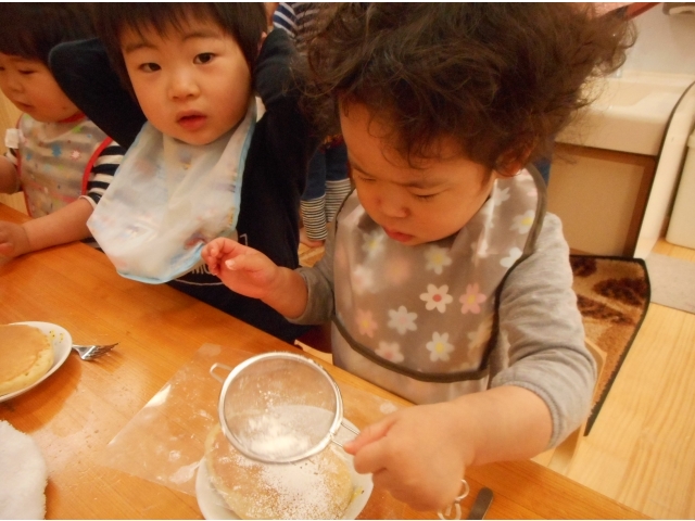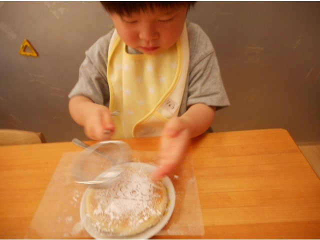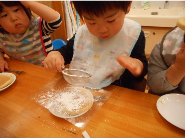 ホットケーキの上に給食の先生手作りのこいのぼりの型を乗せ、その上からお砂糖を振りかけデコレーションしました(^^)/