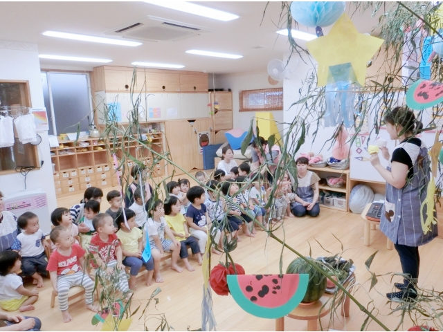 外は、生憎の雨でしたが、「きーらきーらひーかーる♪」とうさぎ組さんがきらきら星の歌を歌ってくれて、元気に七夕まつりがスタートしました。
