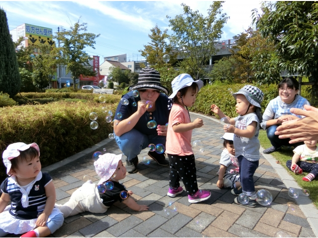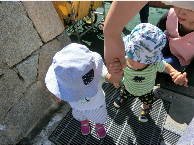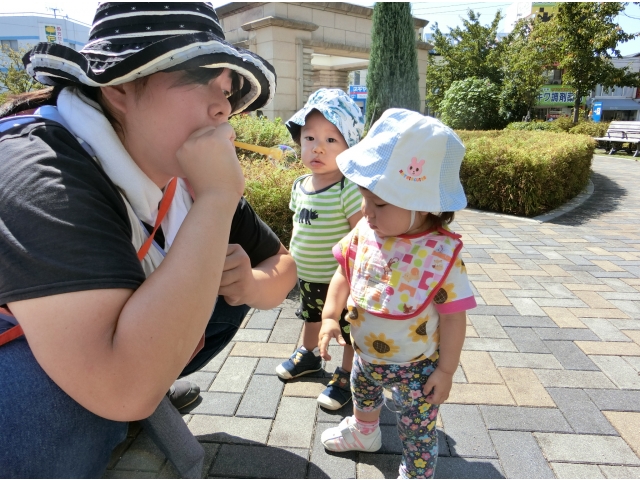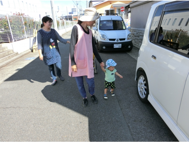 ひよこ組では、天気の良い時に、散歩に出かけています。近場の日赤病院まで、毎回同じルートで散歩に出かけ、車や保育園の看板、草や落ち葉など、様々な発見を子どもたちと一緒に楽しんでいます。