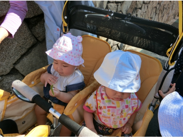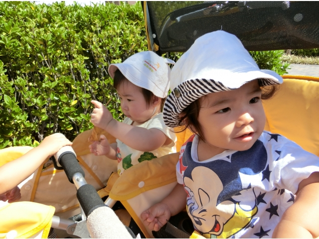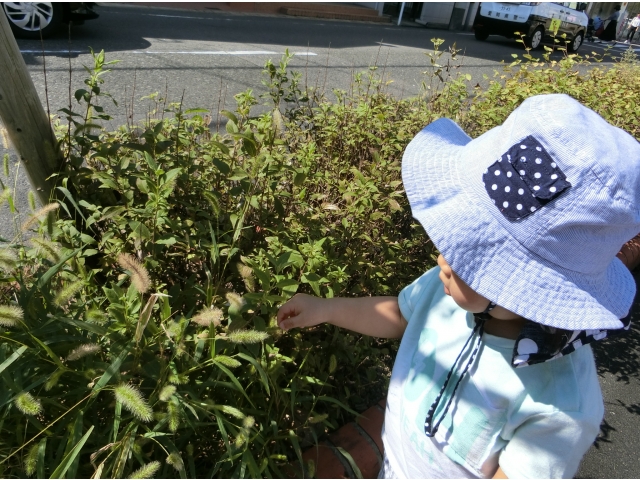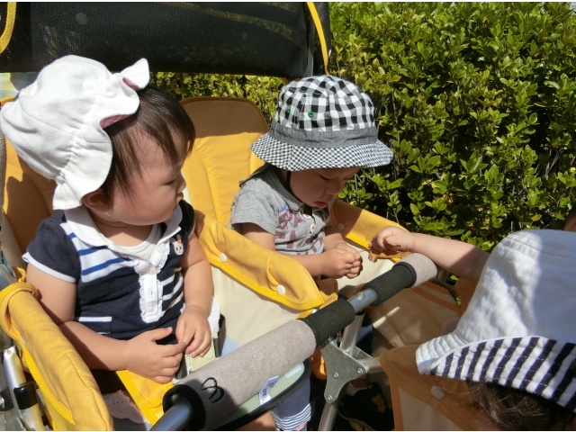 月齢の高い子は、保育者と手を繋ぎ、1歩2歩……としっかりとした足取りで歩き、低月齢児は散歩車に乗り、良い乗り心地の中、身近な草花に手を伸ばす姿も見られます。