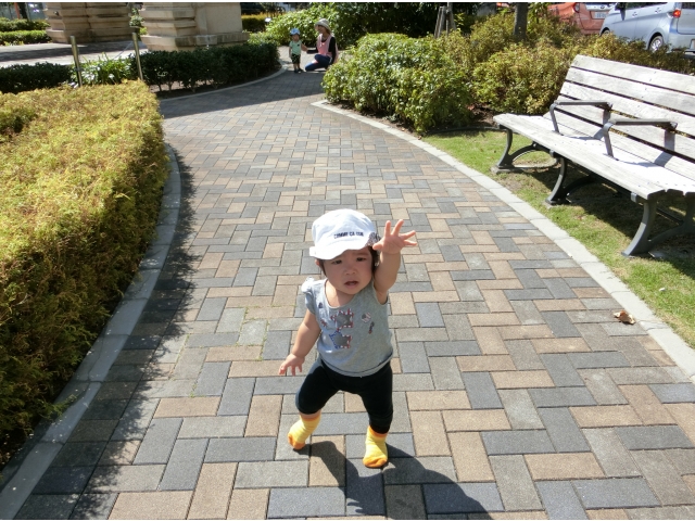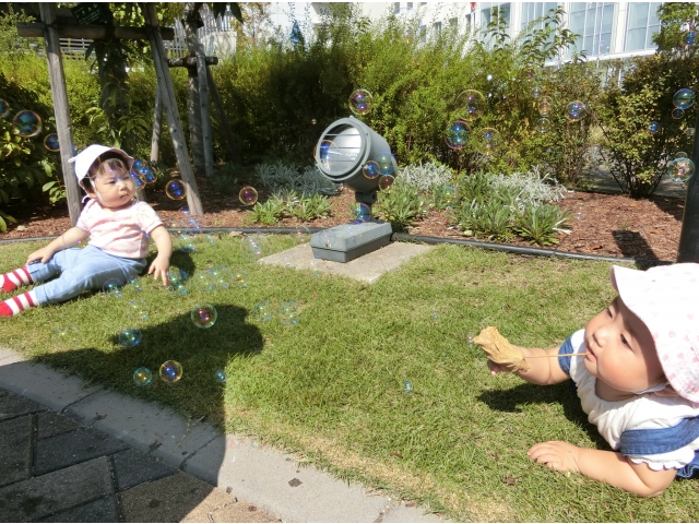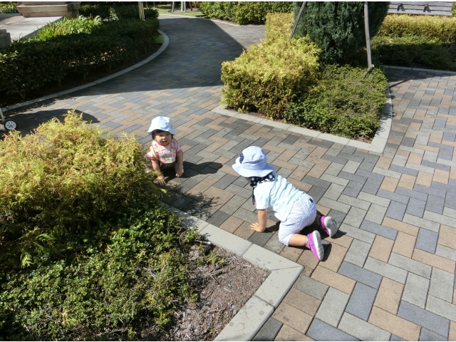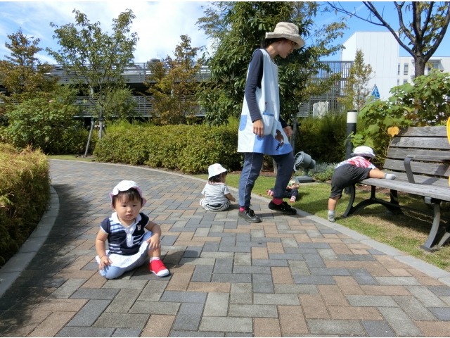 目的地に着き、子どもたちは散歩車から降りると、いろいろな場所へ散策に行っていました。また、先生や友達と「まてまて~」と追いかけっこを楽しんだり、アリやダンゴ虫、トンボなどを見つけて、じっと見たり手でツンっと触ってみたり……
