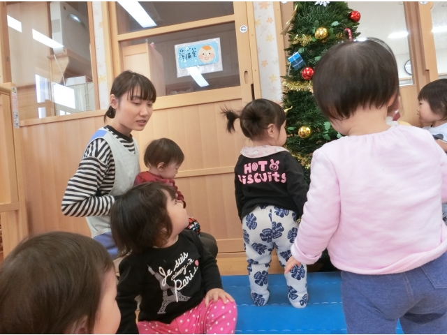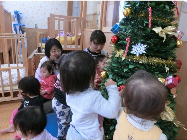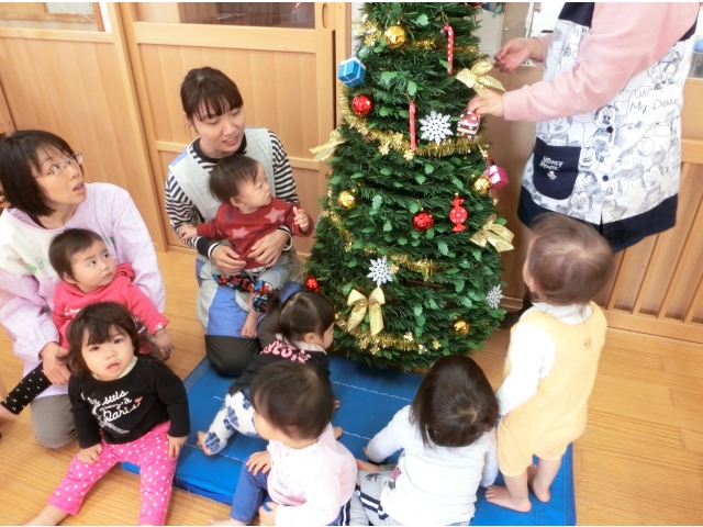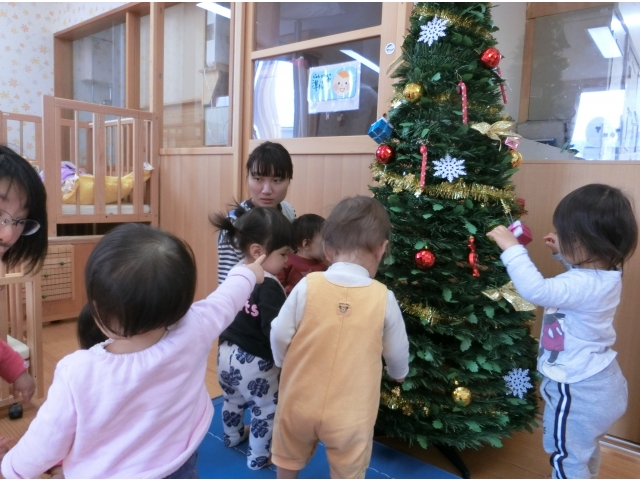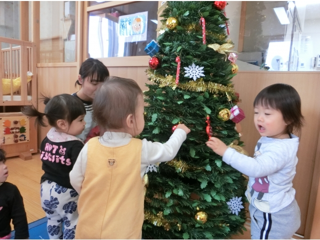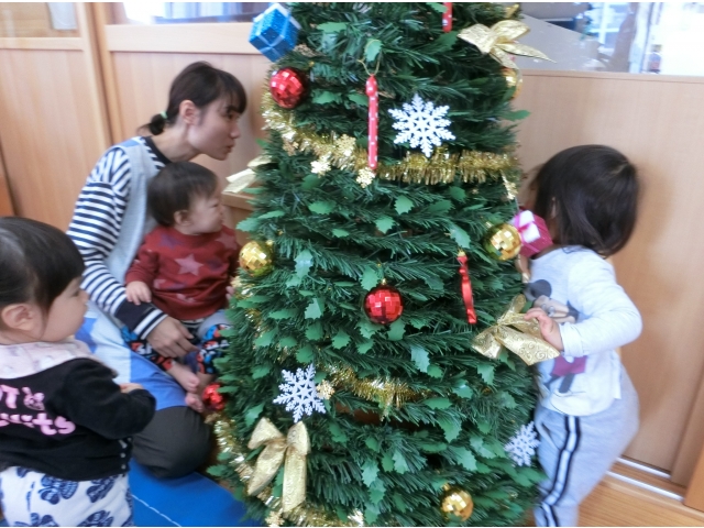クリスマスツリーの大きさに、ちょっと近寄りがたい子もいましたが、気になる子は、ツンツンしてみたり、装飾を触ってみたりとしていました。