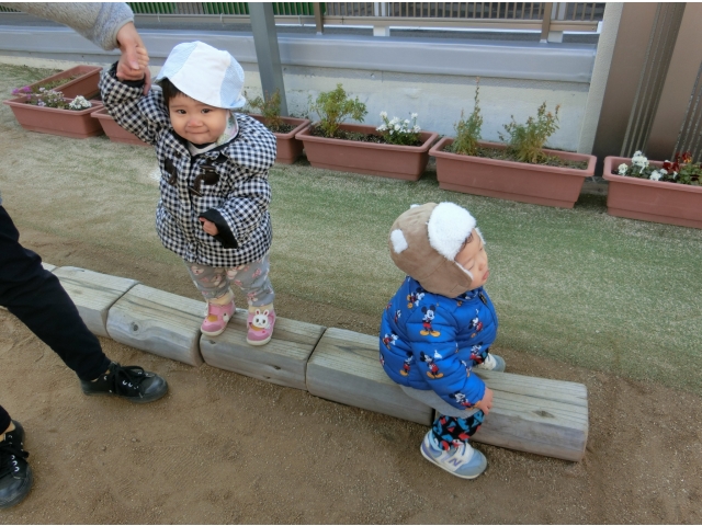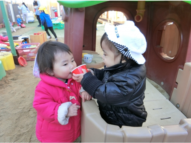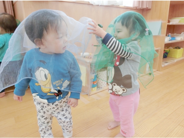 友だちの姿を意識するようになってきた子どもたち。友達の遊ぶ姿を見て、その遊びの真似をしたり、一緒にカバンをもってお出かけしたり…また、朝は友だちが登園すると、手を振って喜んだり、ぎゅ~っと抱きついたりする姿も見られるようになりました。