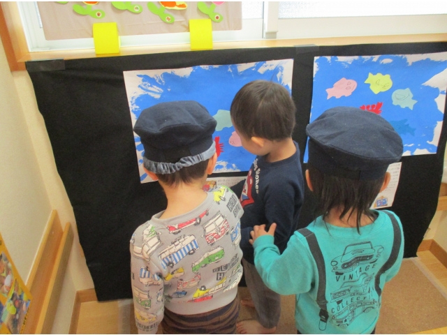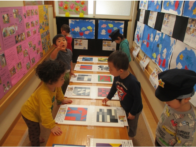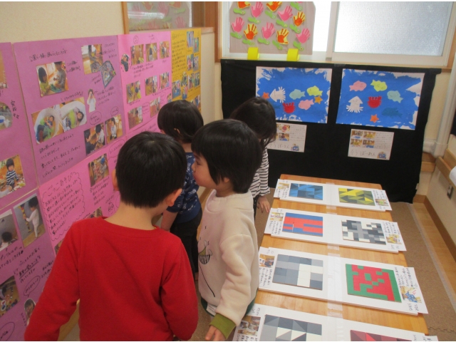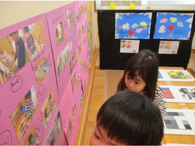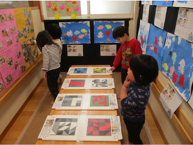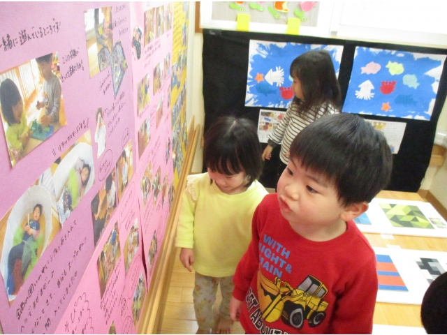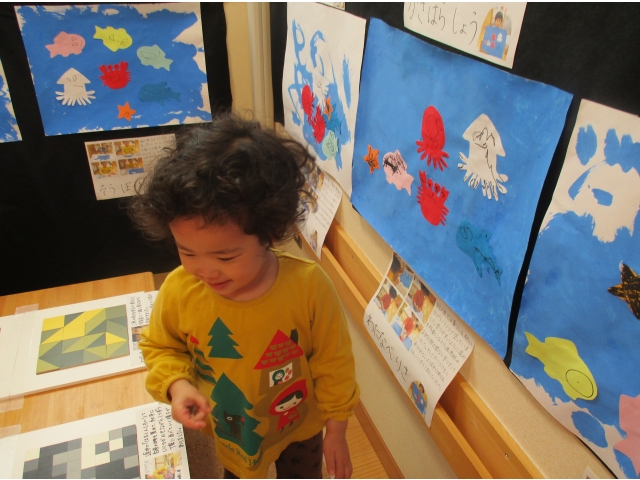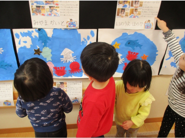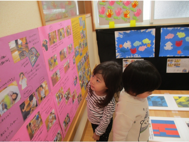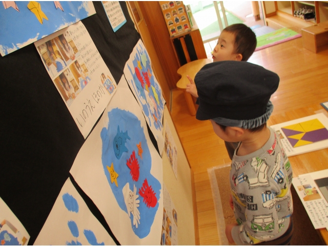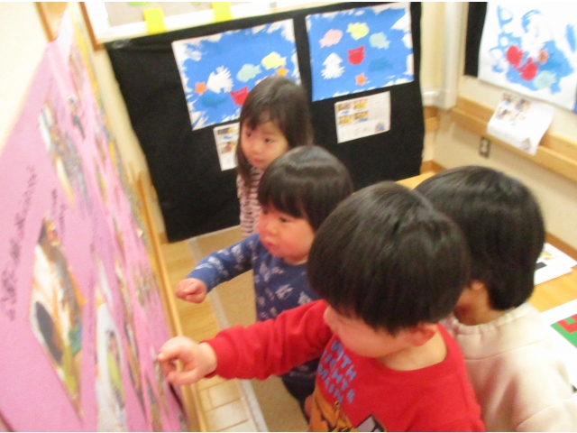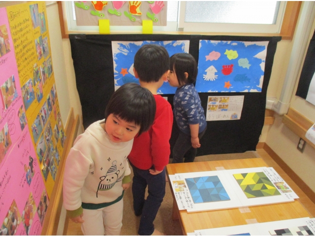 ミニ作品展の大トリはうさぎ組が飾りました✨他クラスの作品が飾られているのを順番に見ていた子ども達は、自分達の番が来たのをとても嬉しそうにしていました!