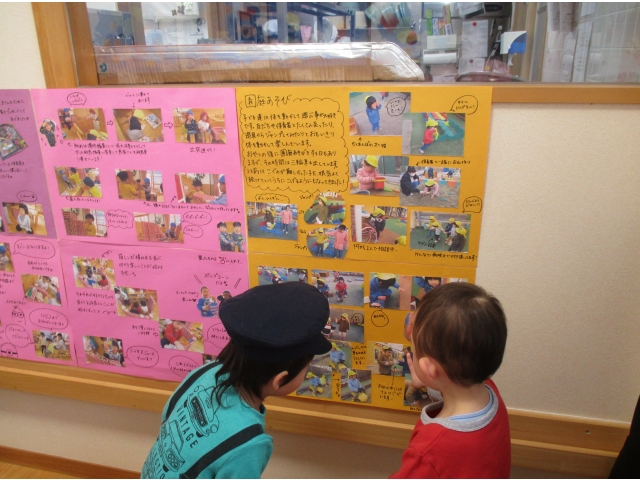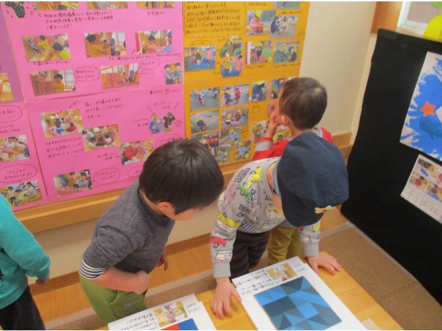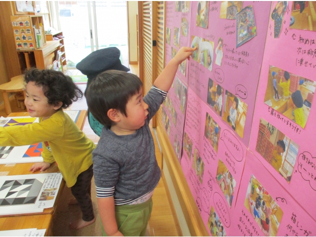 写真を見ながら自分の姿を探したり、「あっ!〇〇ちゃんいたよ!」「これ〇〇やっているときだ!」と思い出して、友達や保育者との会話を楽しみながら見つめている姿がたくさんありました(*^▽^*)