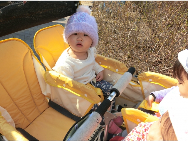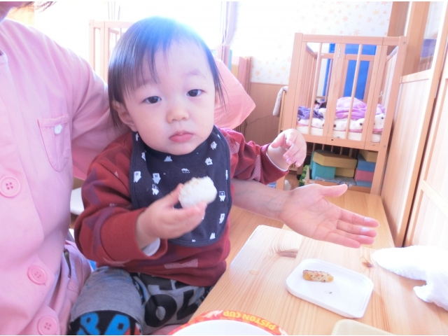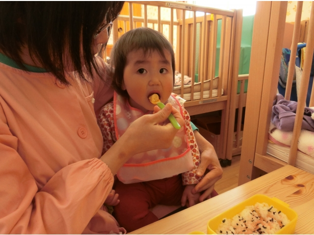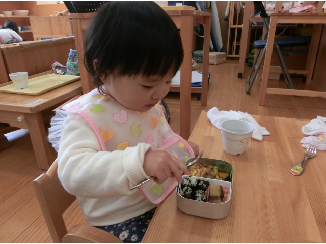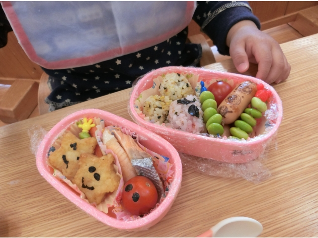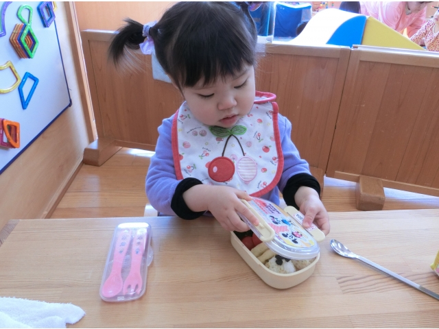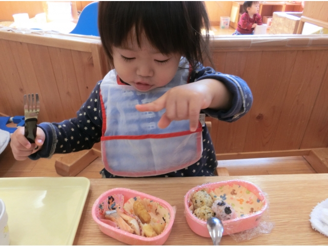 保育園に帰ると、今日は弁当持参日!散歩に行く前から、お弁当が置いてある台を指さしたり、「だっこ~」とお弁当を見たいアピールをしたり、子どもたちはなんだかウキウキ☆