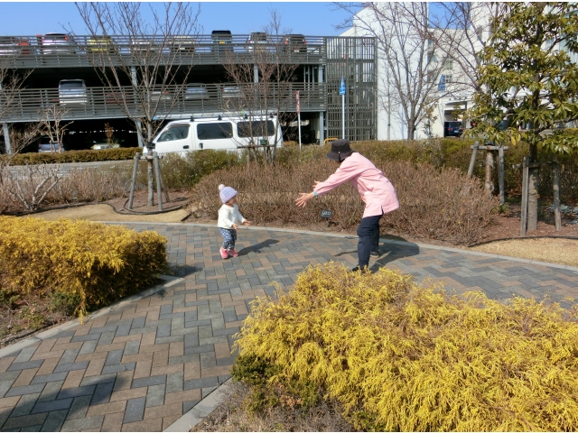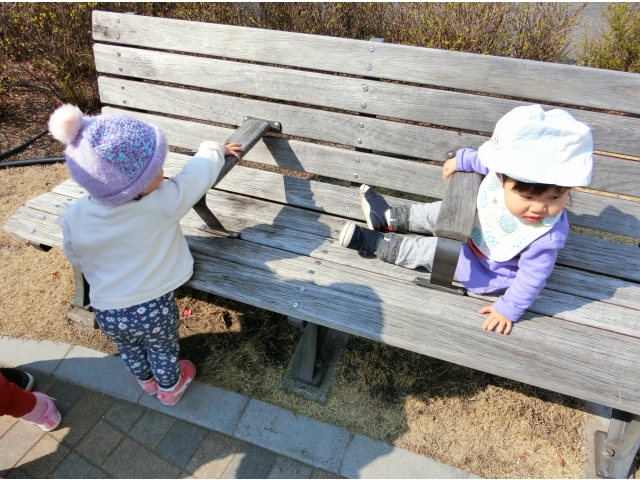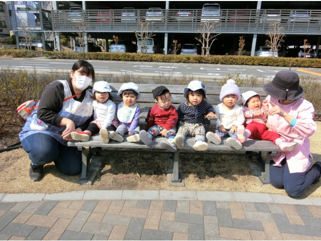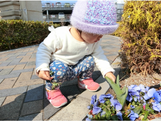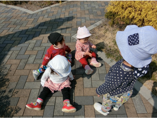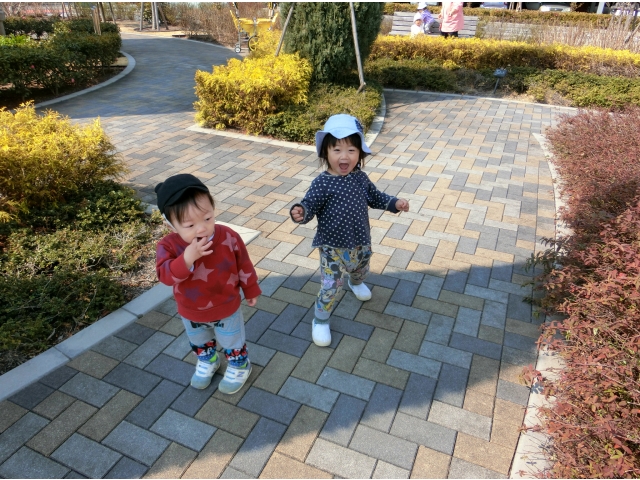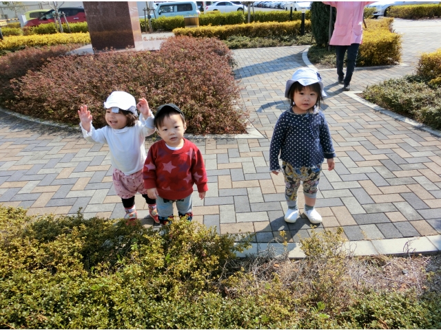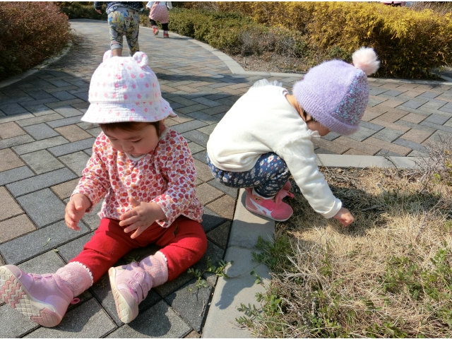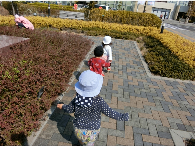 日赤病院へは、何度か散歩でお邪魔しているので、目的地に着くなり、「きゃーーー!(^^)!」と走り回る子ども達。保育者や友だちと一緒に「まてまて~」と追いかけっこを楽しんだり、葉っぱやきれいに咲いている花を見つけて、チョンっと触ってみたり、ベンチの裏など覗いたり……一人ひとりが、散策や体を動かして遊ぶことを楽しみました♡