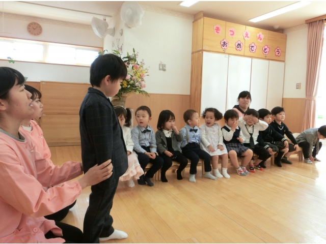 練習の時には、堂々とかっこよく行進する子どもたちも、今日はたくさんの保護者の方に見守られ、ちょっと恥ずかしく、はにかみながら行進する子どもたち……以前までなら、会場の雰囲気などで泣けてきたり、保育者の抱っこから降りられなかったりしていた子も、自分の足で行進し、大好きな先生から名前を呼ばれ、恥ずかしながらも卒園証書を取りに行く姿に、成長を感じました!!