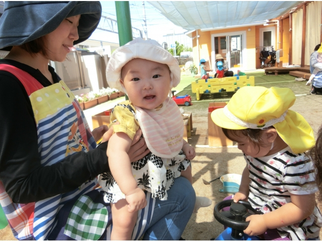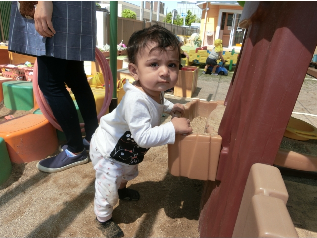 入園してから2か月がすぎました。子どもたちは園での生活にも慣れ、職員が「お外に遊びに行こう」と誘うと、園庭の方を見たり、自分で、出入り口へ向かって歩いていったり…。日々、そういったやりとりをして、楽しんで過ごしています。