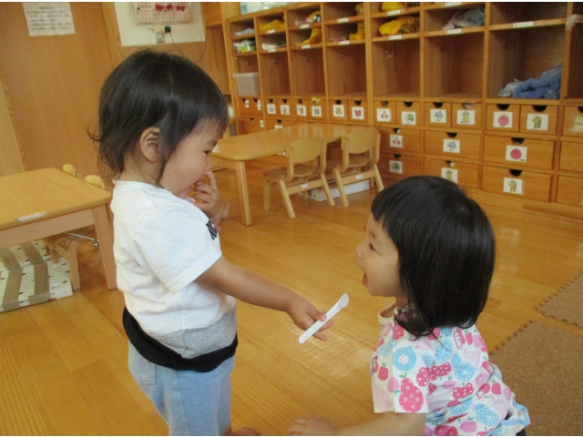 その反面、玩具の取り合いなどで、トラブルになることも増えてきました。その都度、保育者がそれぞれの思いを受け止め、保育者が気持ちを代弁したり、簡単な言葉での思いの伝え方を知らせたりし、思いを理解してくれる安心感や嬉しさ等を味わえるようにしています。