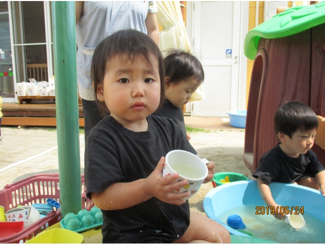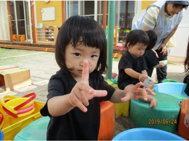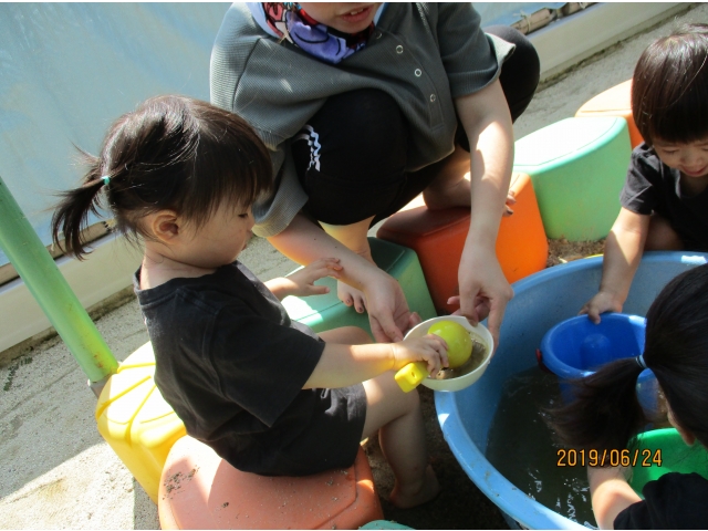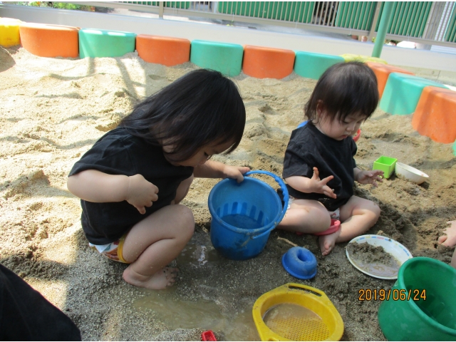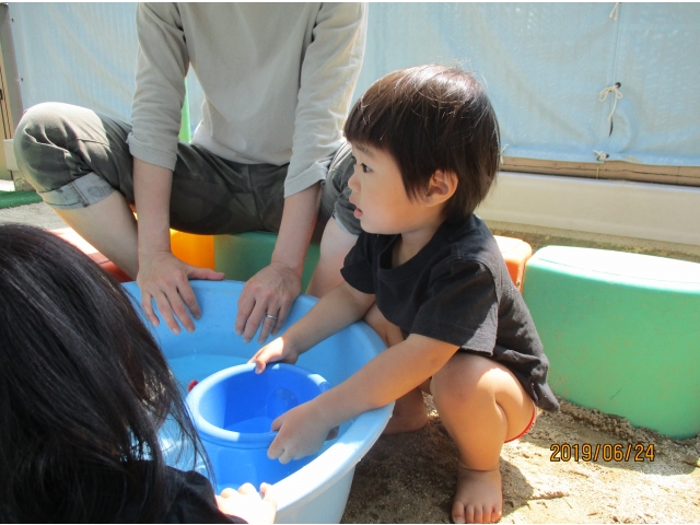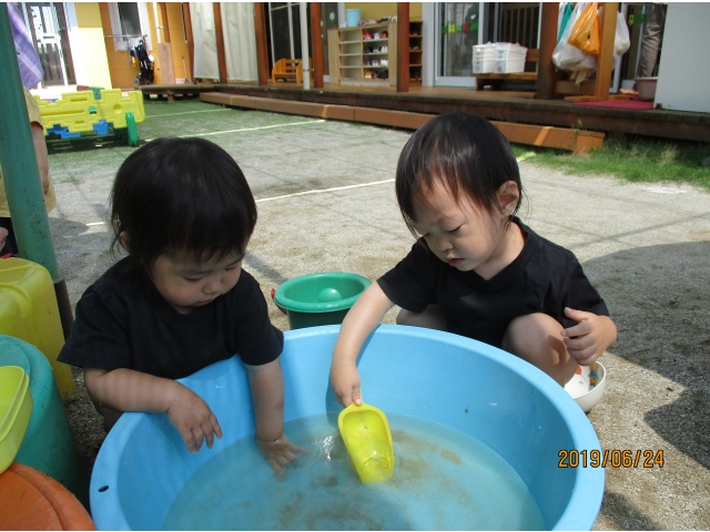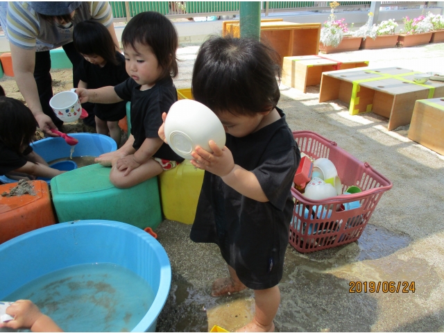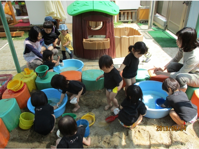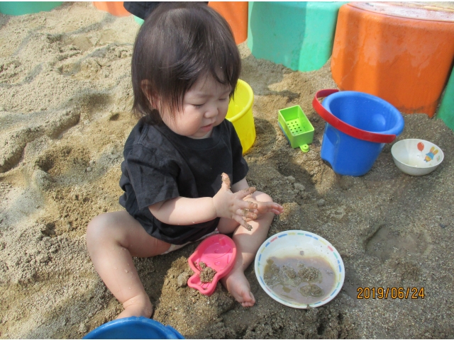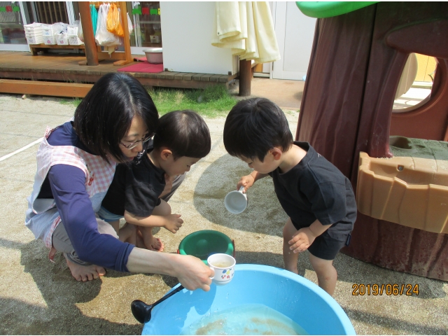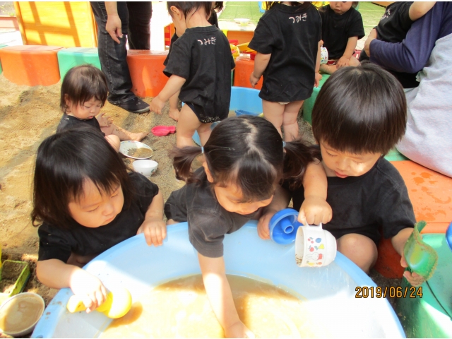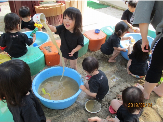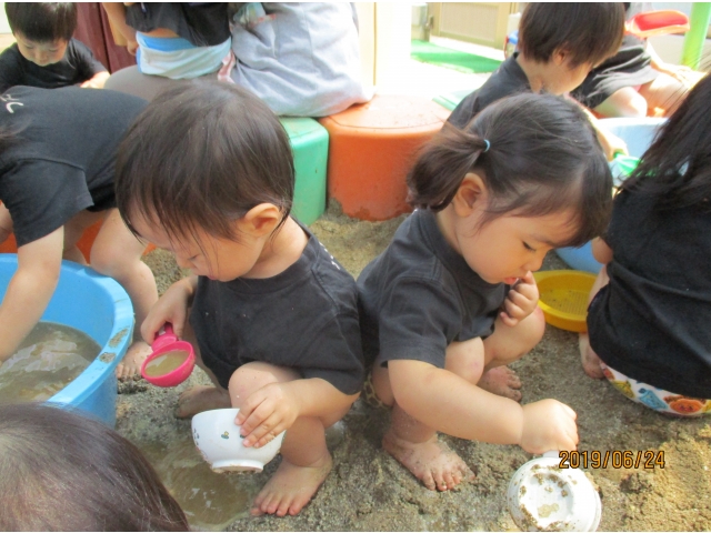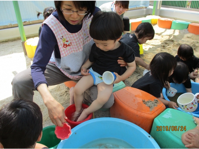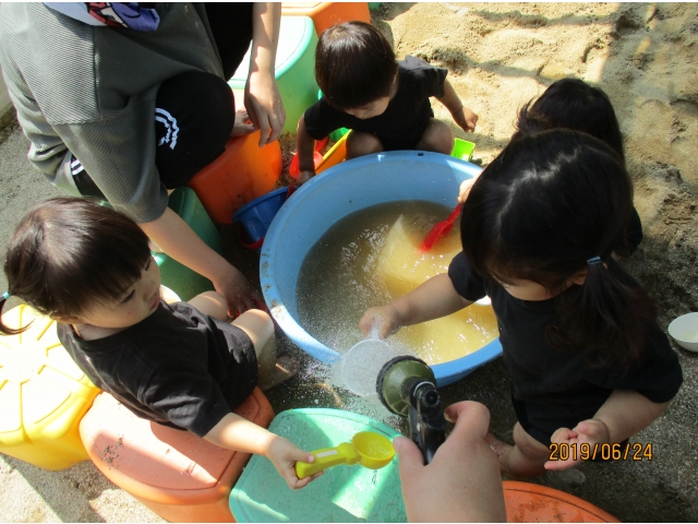 やっと砂場にたどり着くと、早速水が入っているタライを見つけ、手を入れてみたり、砂場の玩具で水をすくってみたり……また、保育者がバケツに水を入れ、砂場へジャーーっと流すと、泥の水たまりができ、子ども達はその中に足を入れたり、泥の塊を触ってみたり、一人ひとりが、泥の感触や水の冷たさを感じている様子でした!!