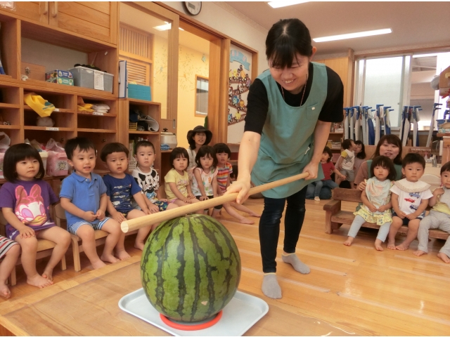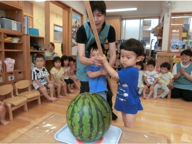 大きなすいかをどのように割るのか子ども達はワクワクしていました。保育者からのやり方を聞いた後、うさぎ組さんから棒を使って割るのをチャレンジしてもらいました。