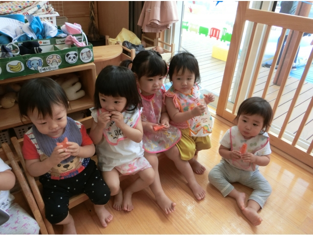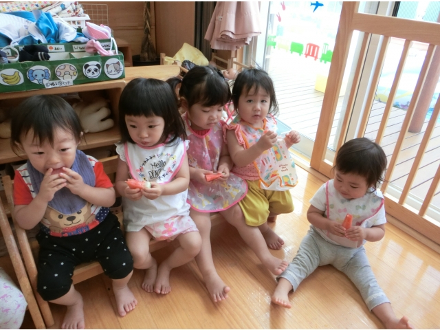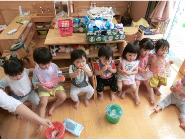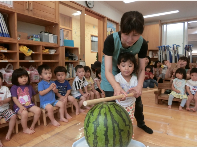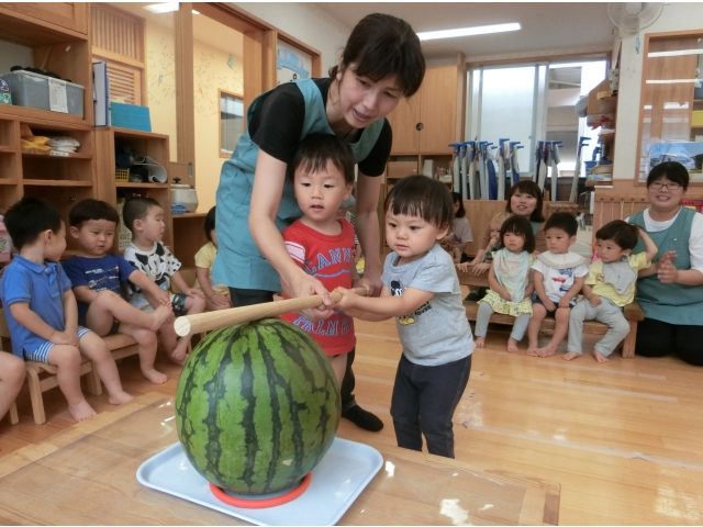 その後りす組さんは保育者が手作りをしたすいか割りに挑戦してくれました。すいかを棒で叩いてぱかっと割れることに感動していました。