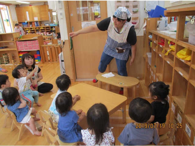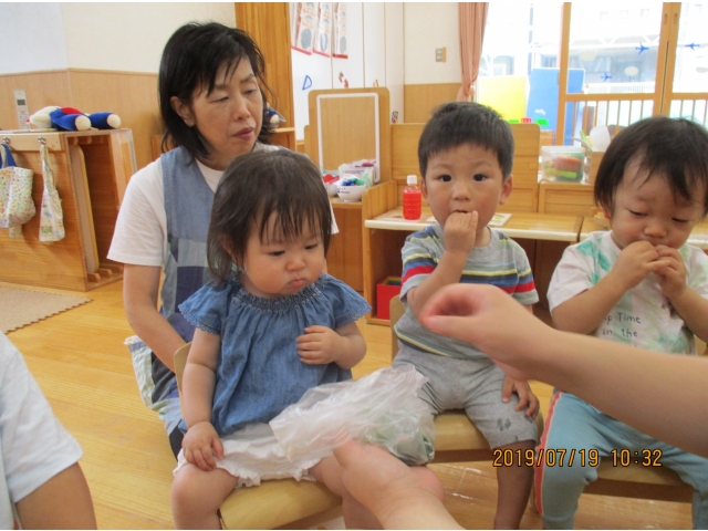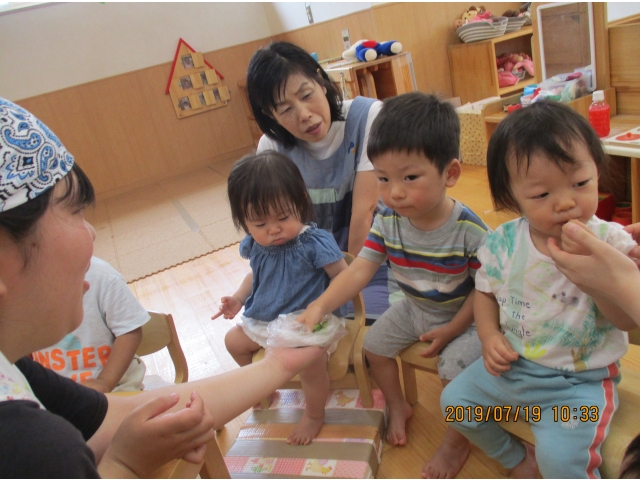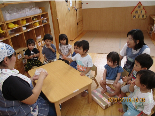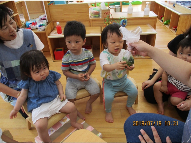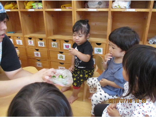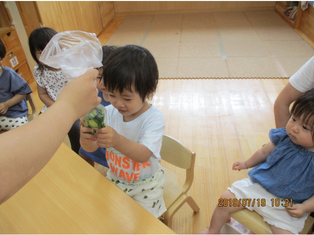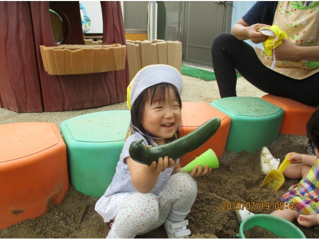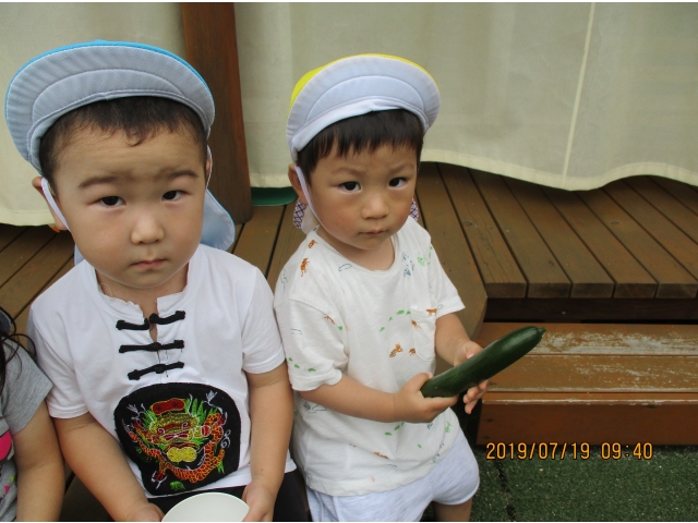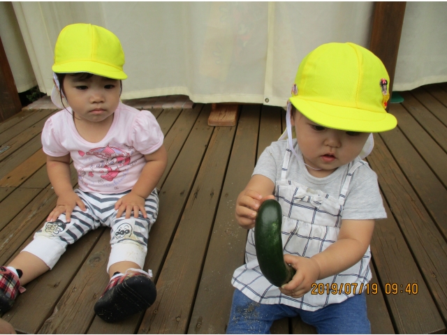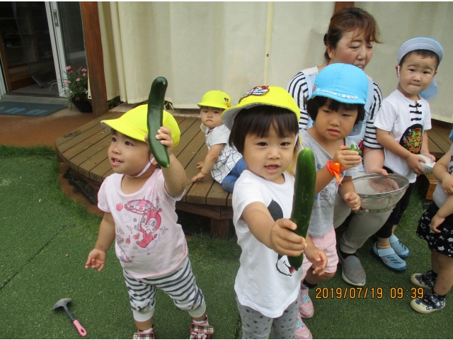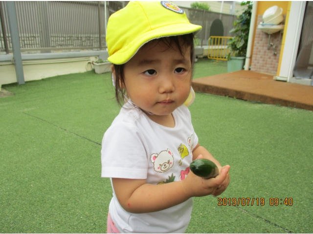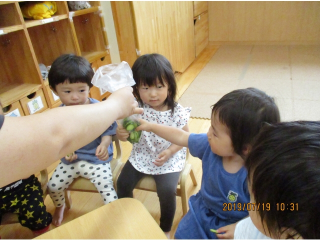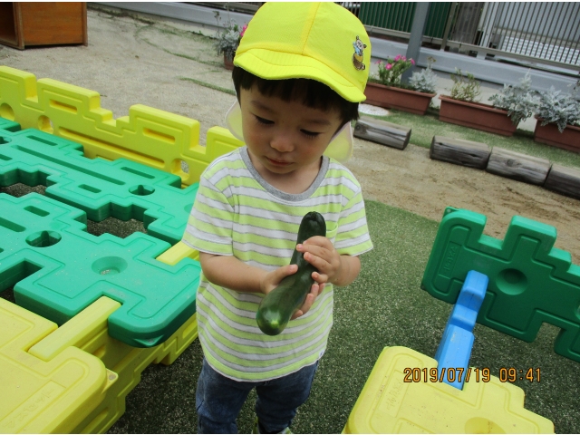 うさぎ組が園庭で育てている、夏野菜のきゅうりが大きくなったので、1本りす組に頂きました。主にうさぎ組の子ども達が、水やりなどをしていましたが、りす組の子ども達も、水やりをお手伝いする姿もありました!(^^)!
