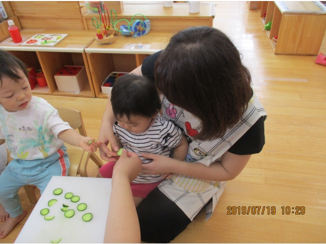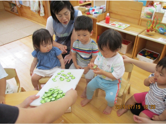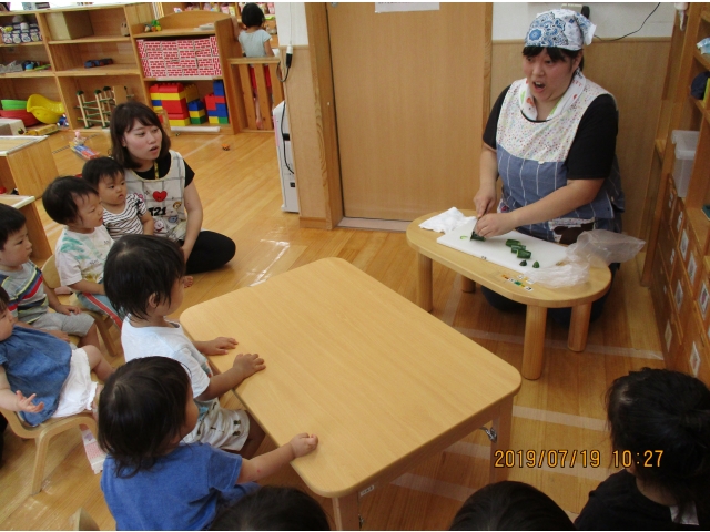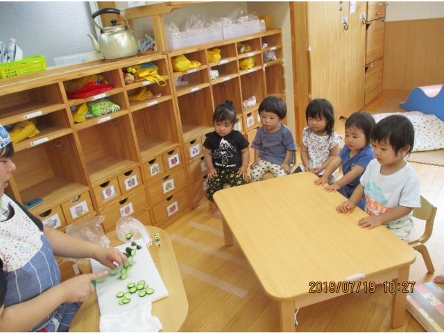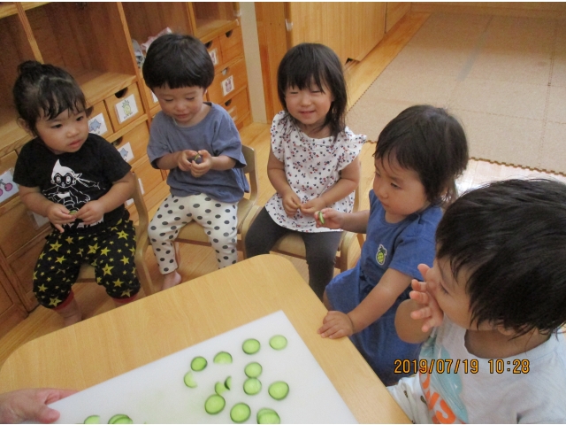 きゅうりを包丁でザクっとし、トントントントンと切っていく保育者の姿を、真剣な眼差しで見入る子ども達。すべて切り終えると、「はやくたべたい!!!」との声が……!(^^)!